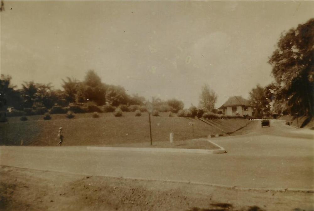 Nederlands Indië; tuin, grasveld, huis, jeep, weg