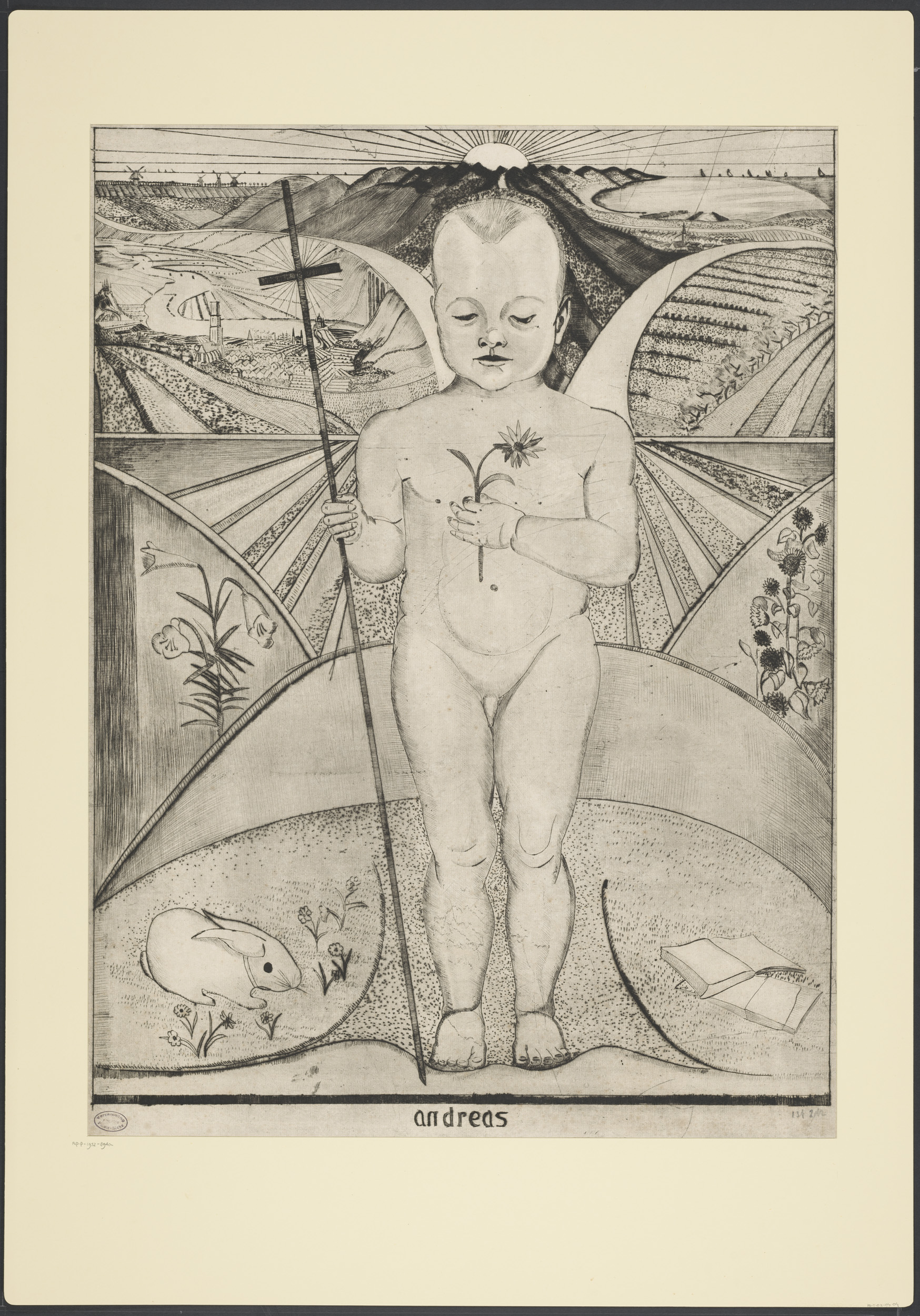 Christus met gespreide armen in een heuvellandschap