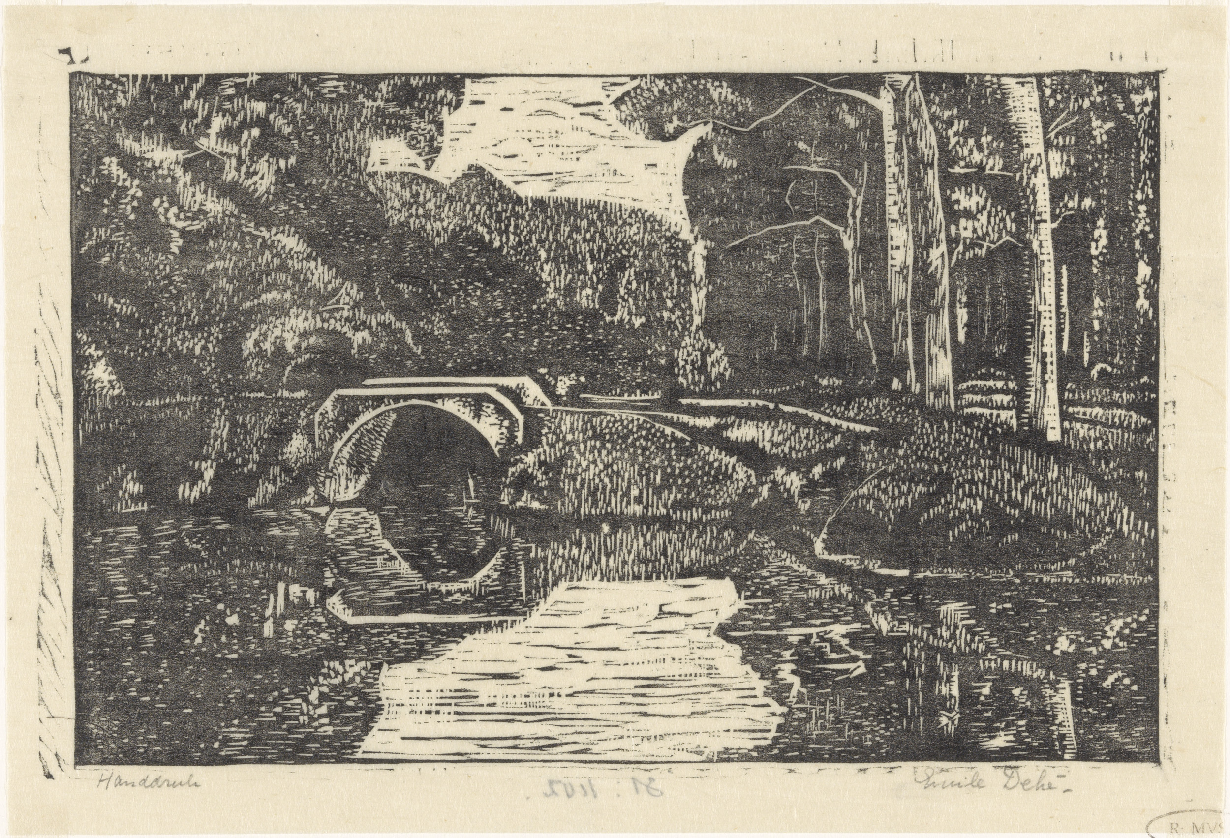 Brug over een gracht in een bos