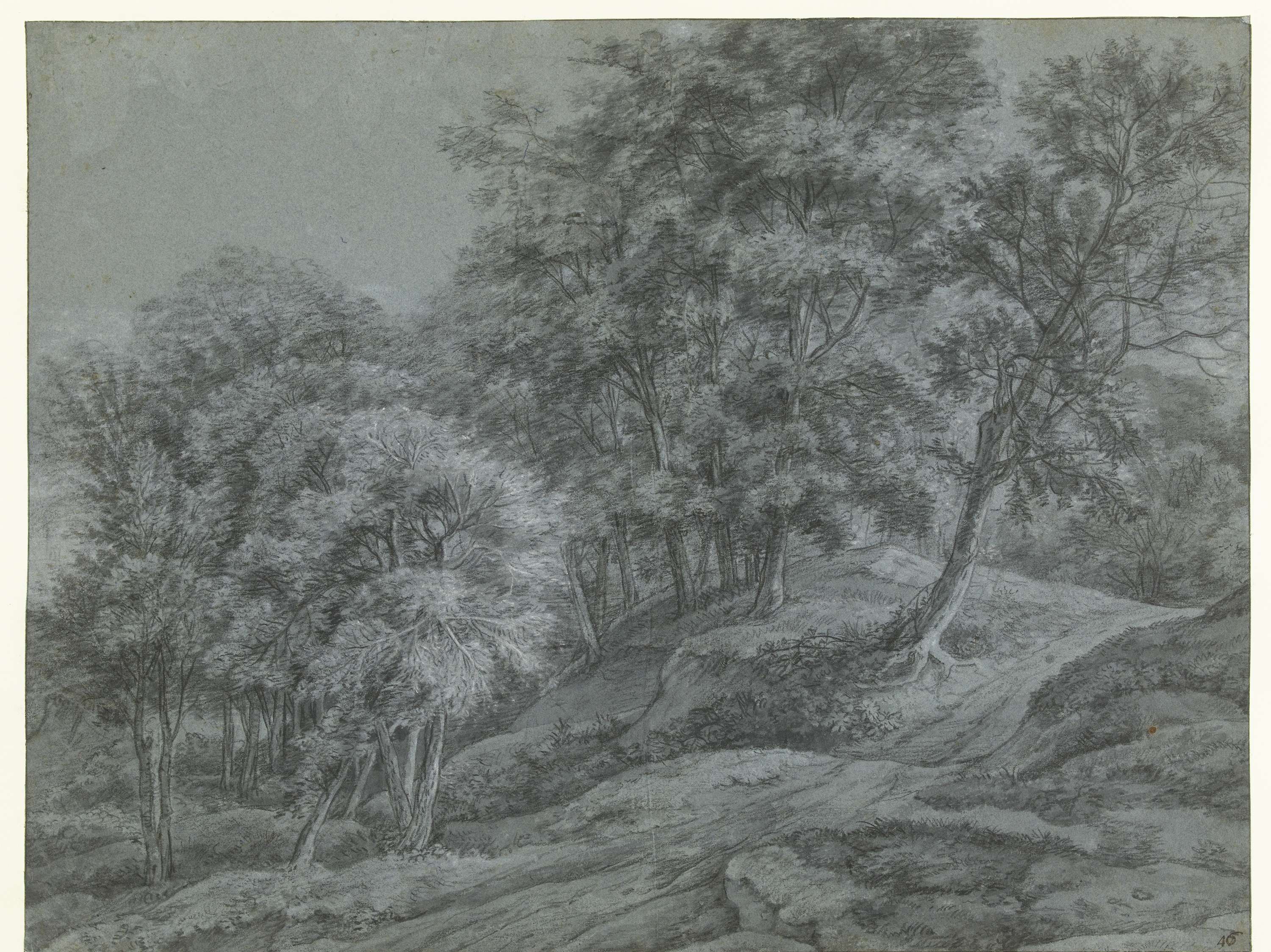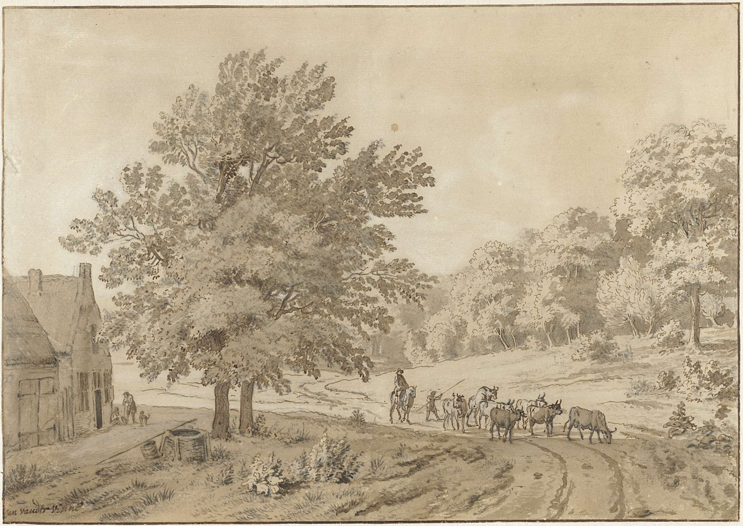 Landschap met bomen, ruiters en enkele koeien in een...