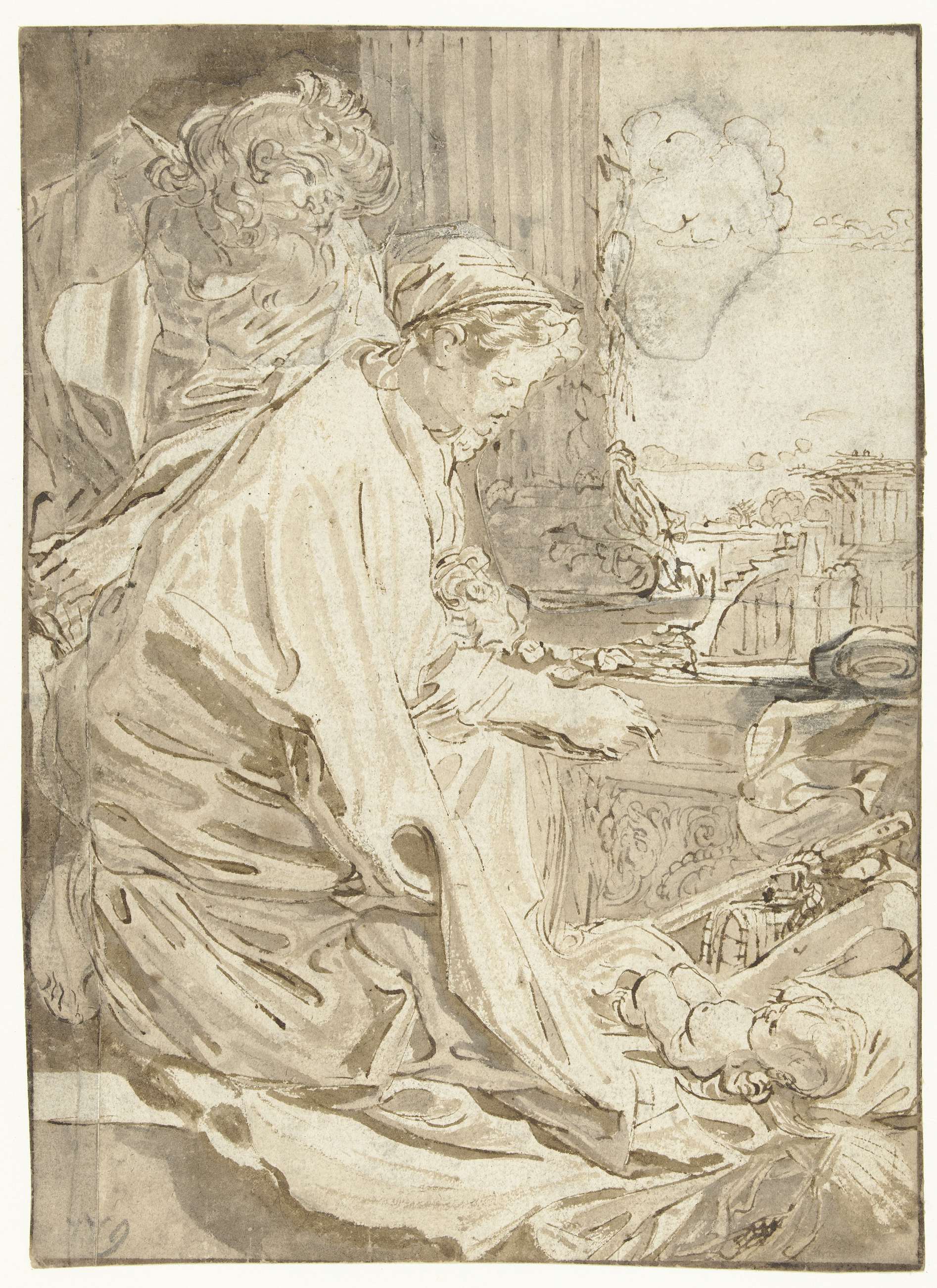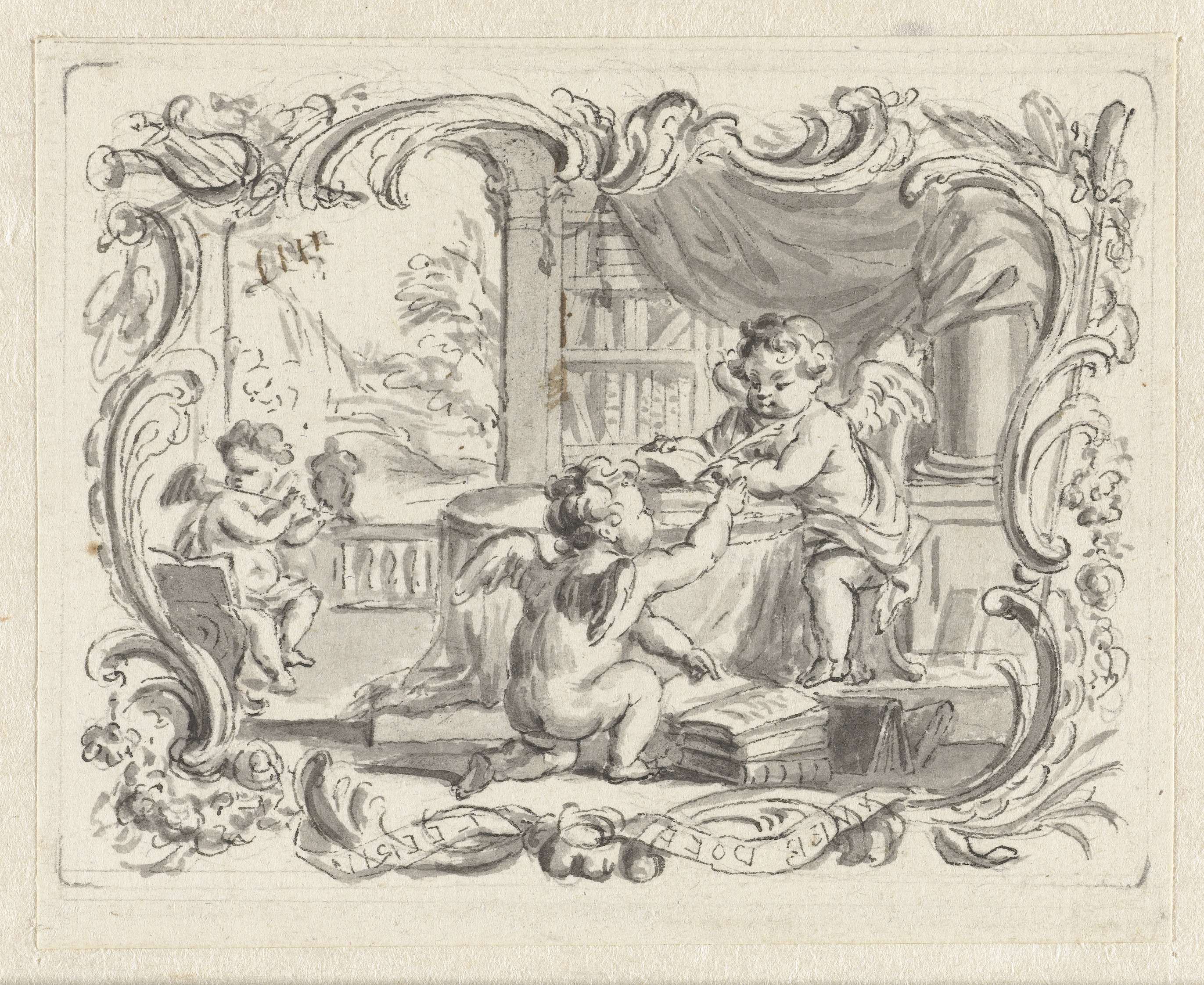 Vignet met putto, schrijvend in studeervertrek