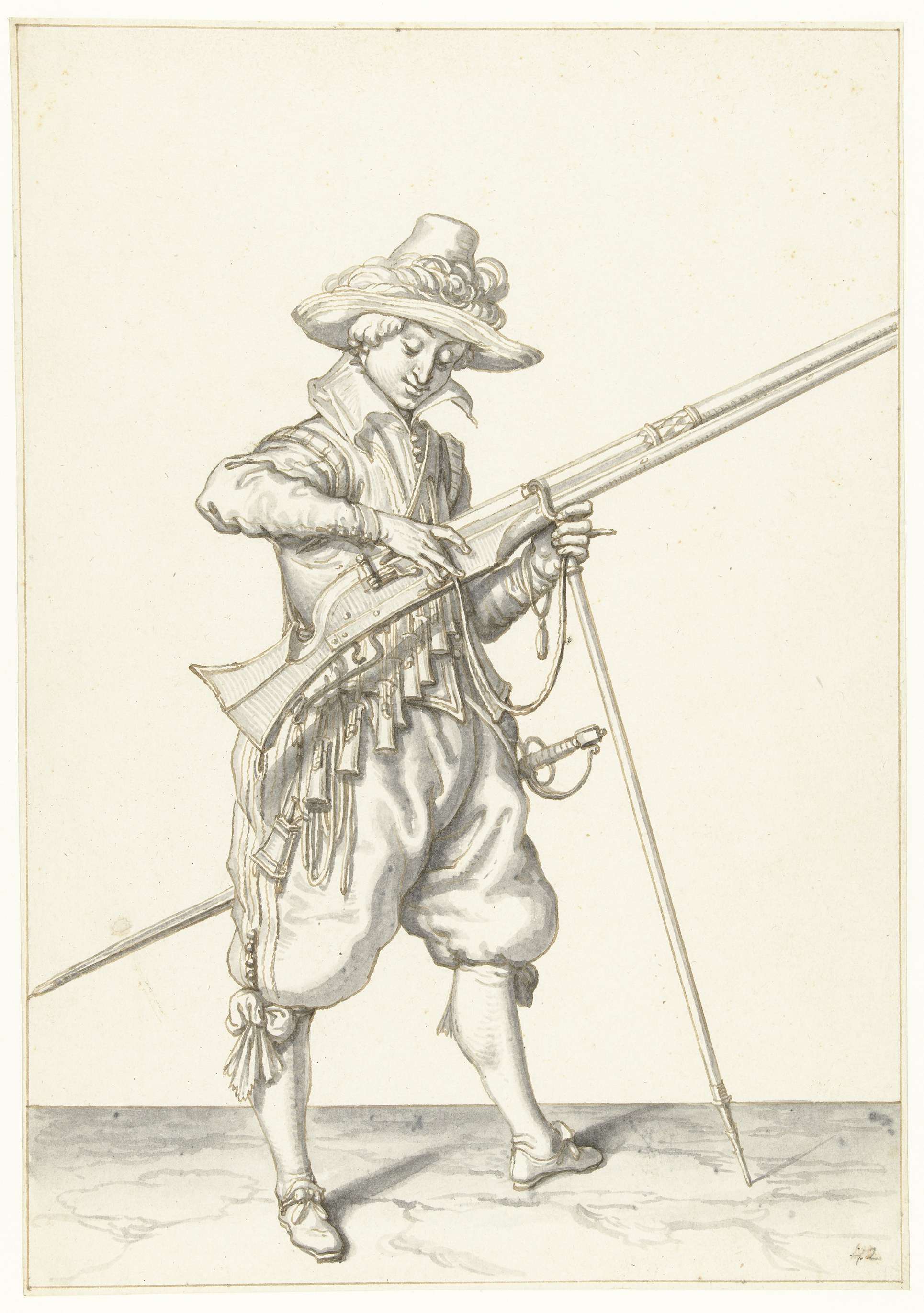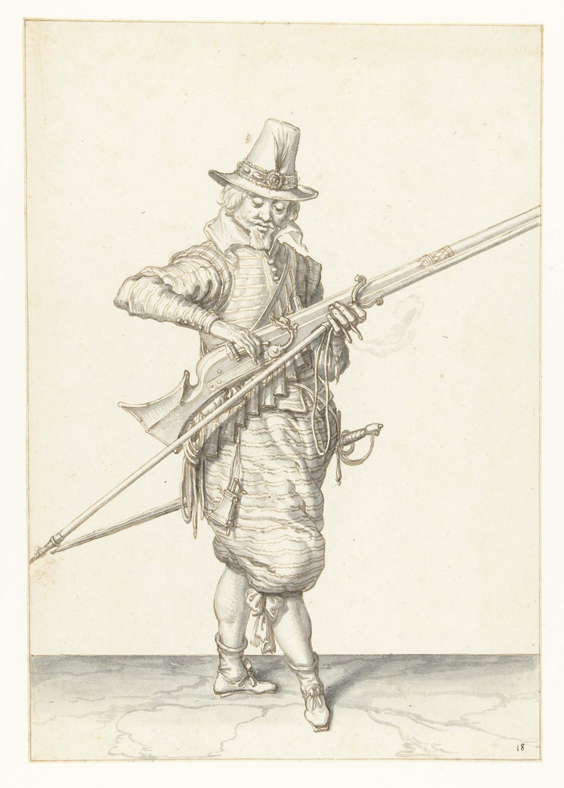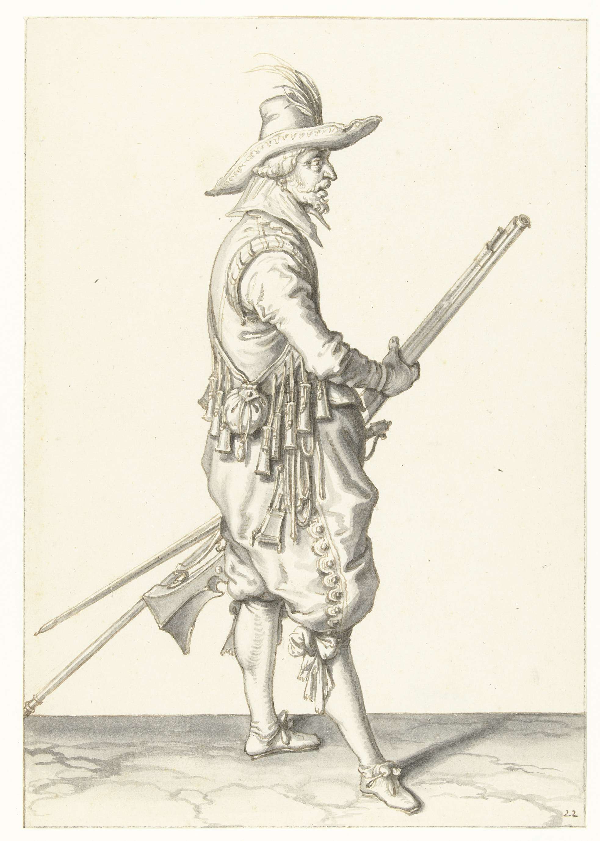 Soldaat die zijn musket met beide handen bij zijn li...