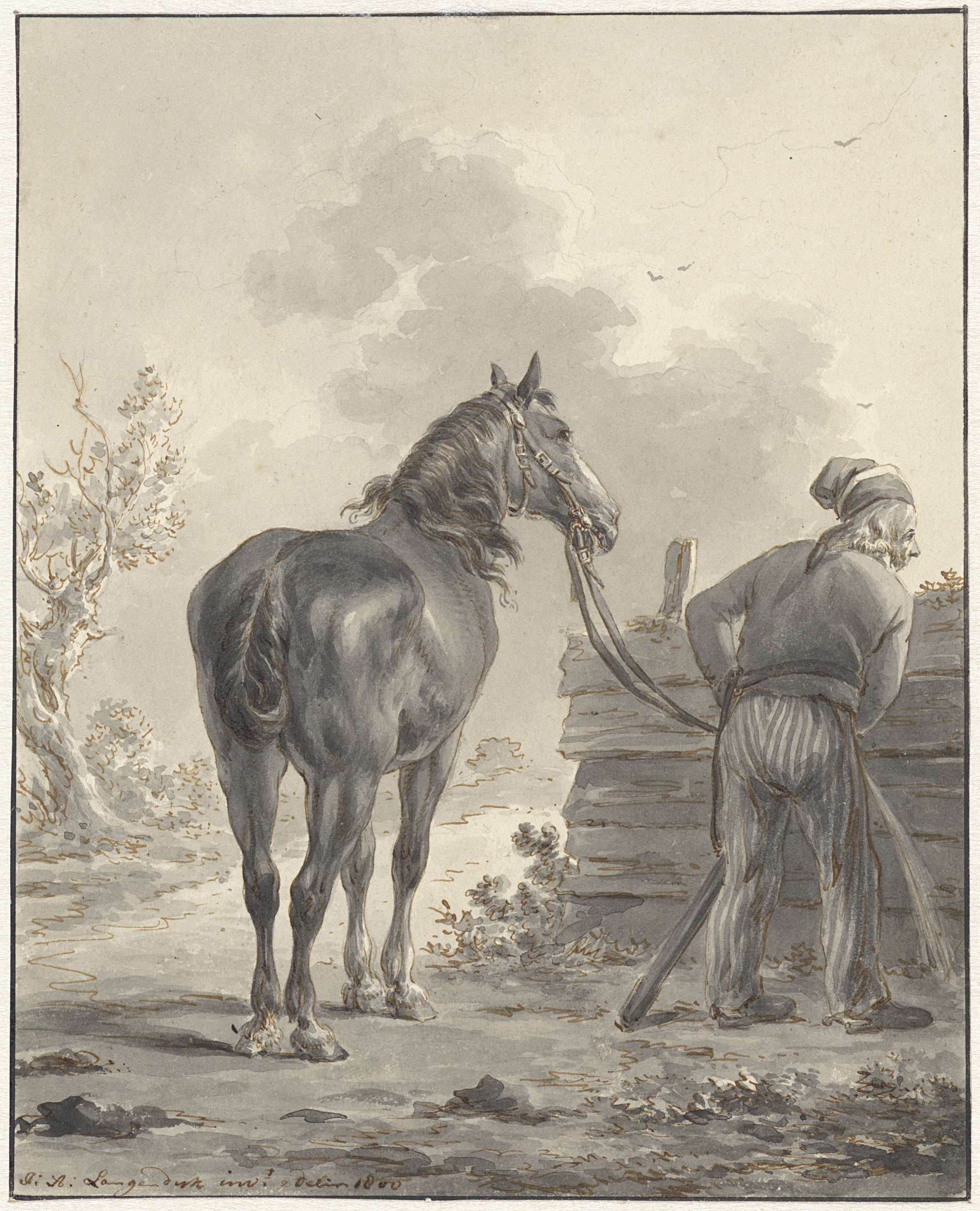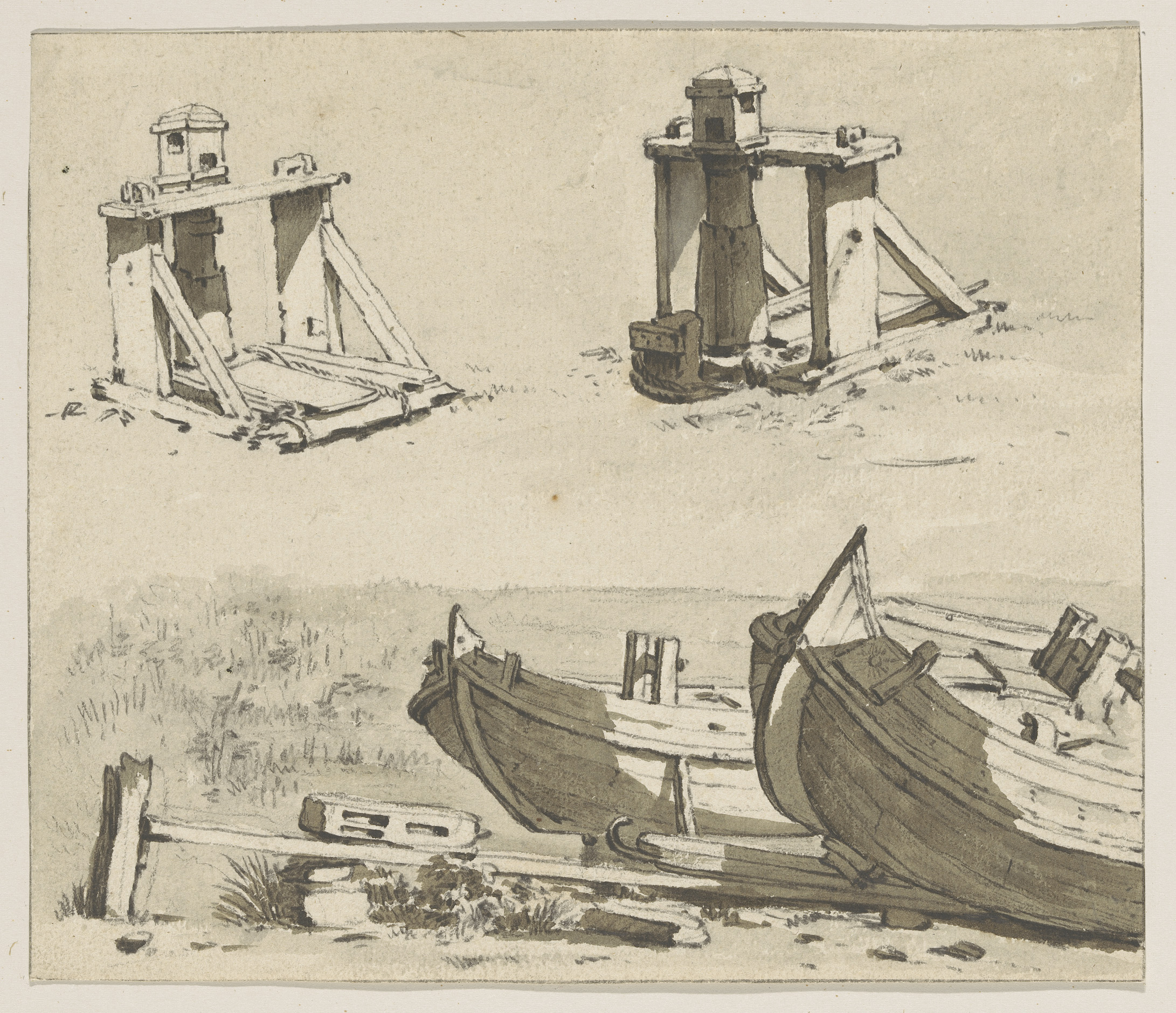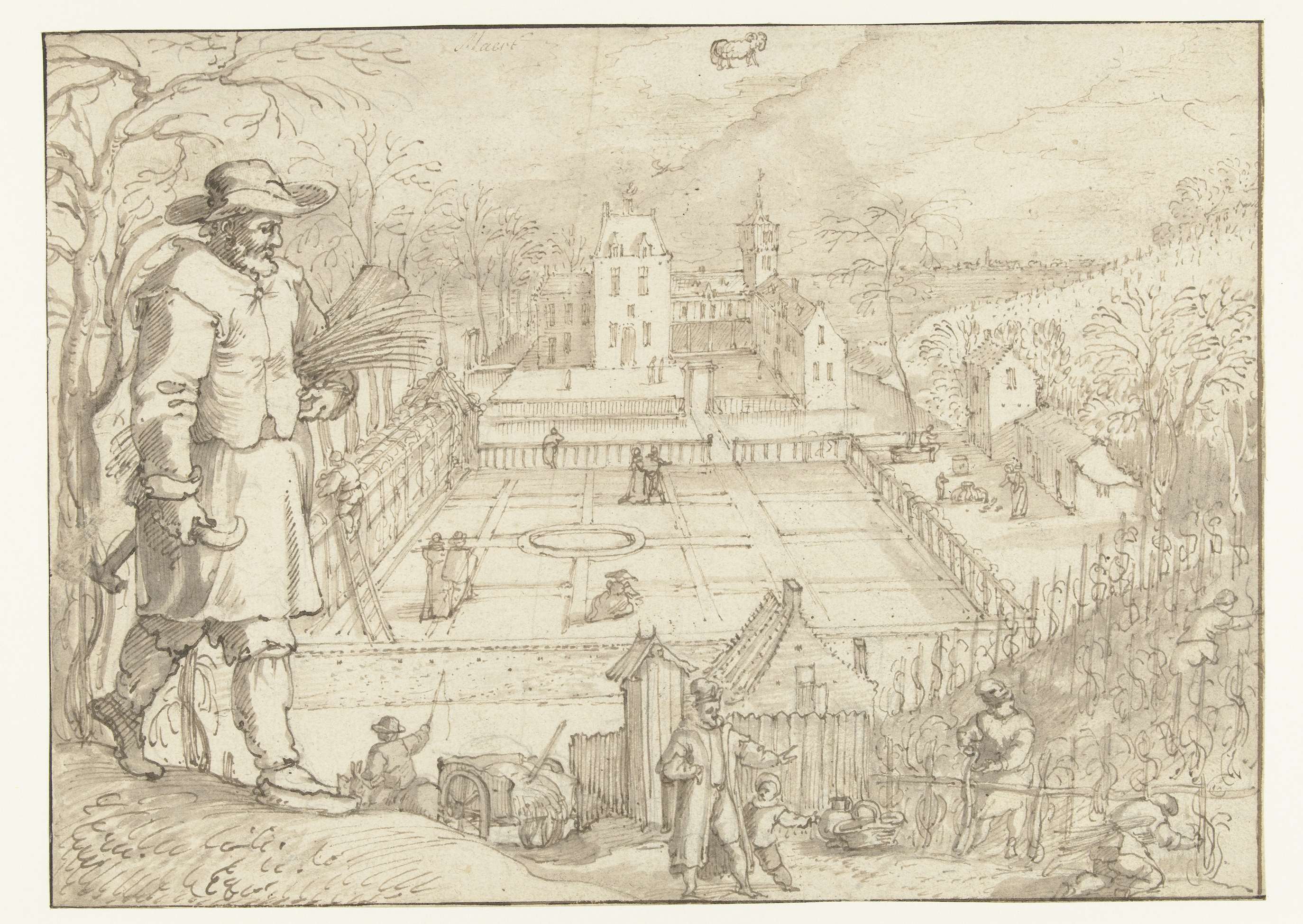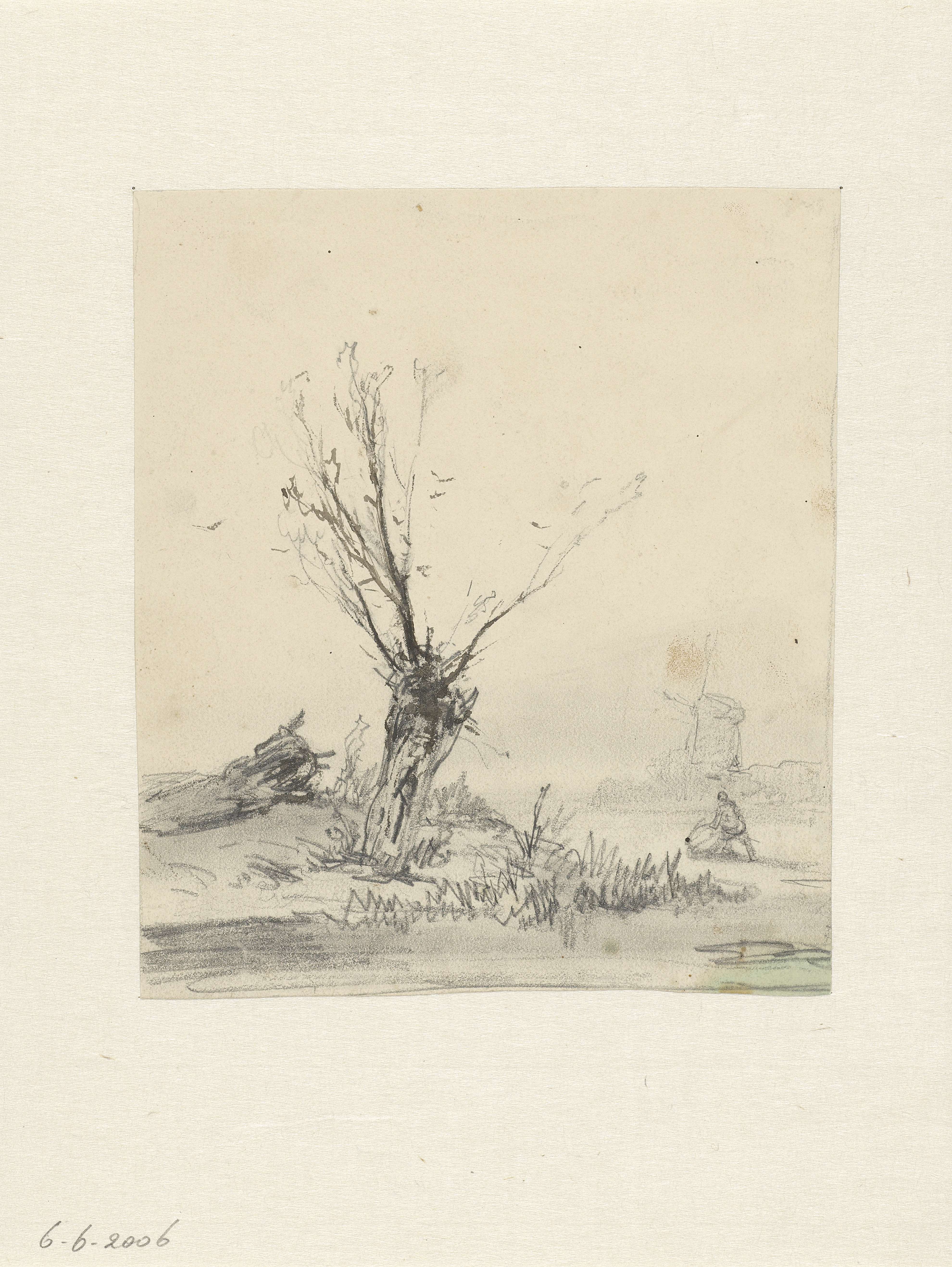 Landschap met twee mannen bij een aanplakbord bij ee...