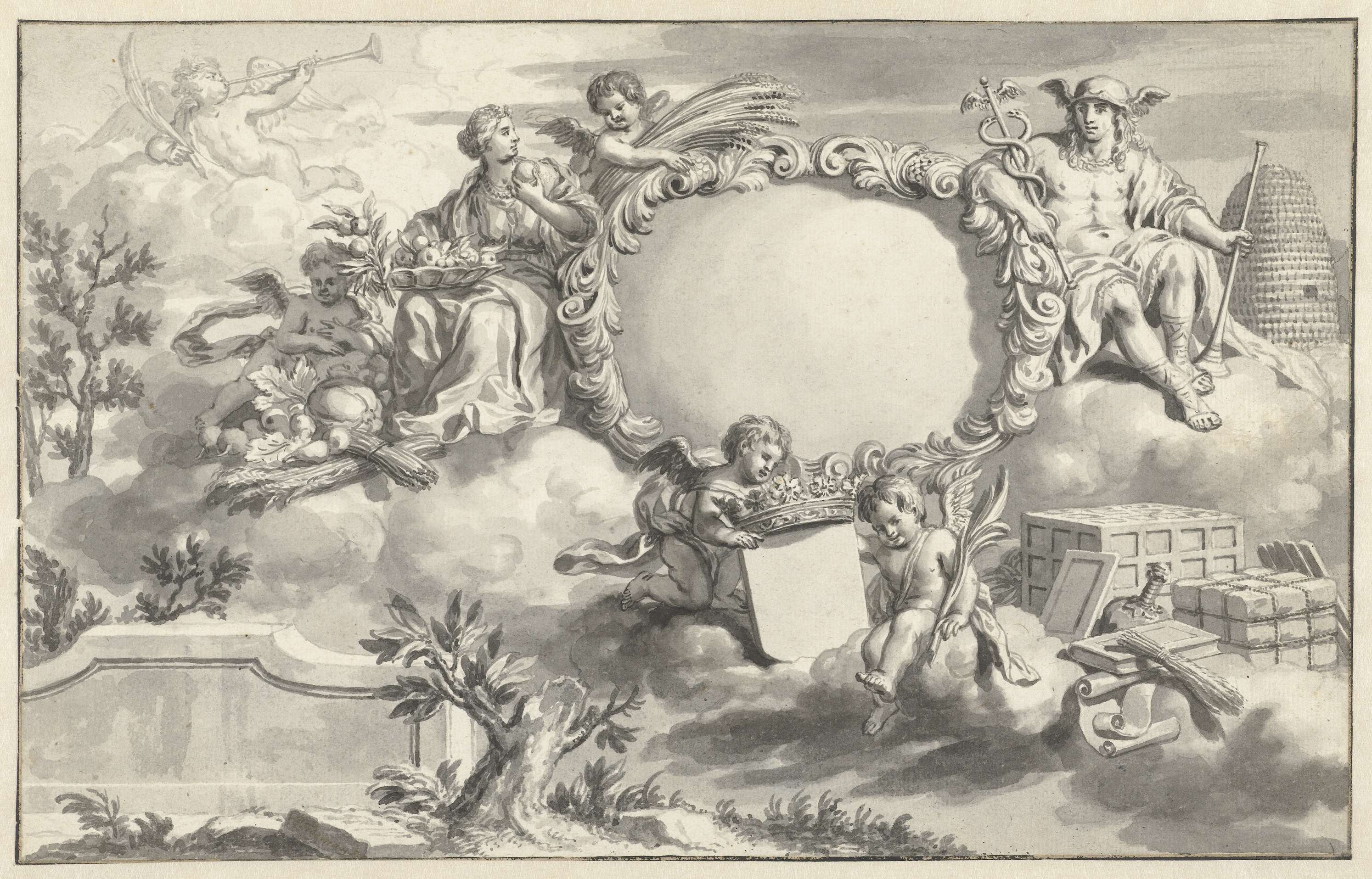Allegorische voorstelling met cartouches en diverse ...