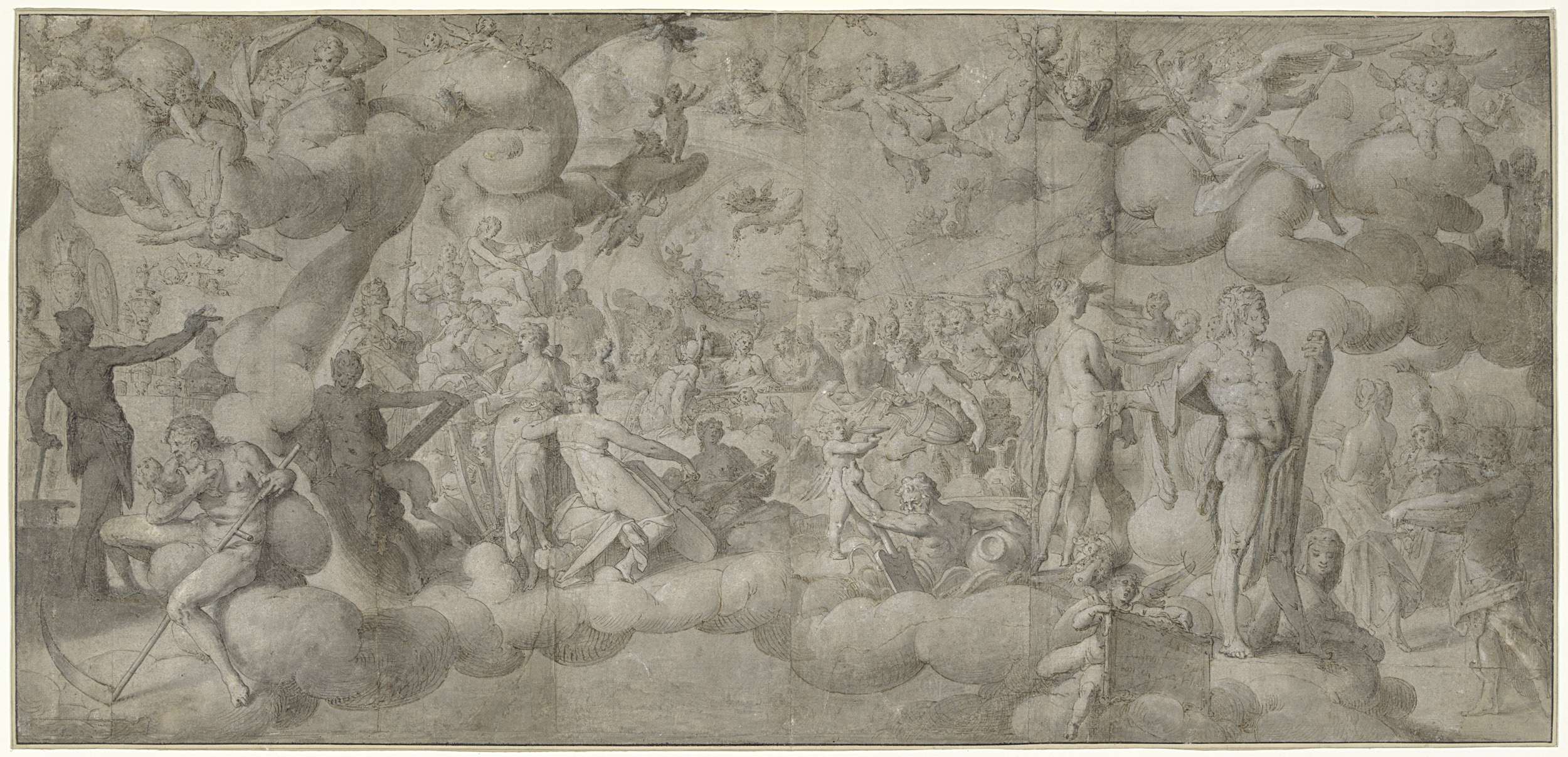 Vignet van putti op wolken met boeken