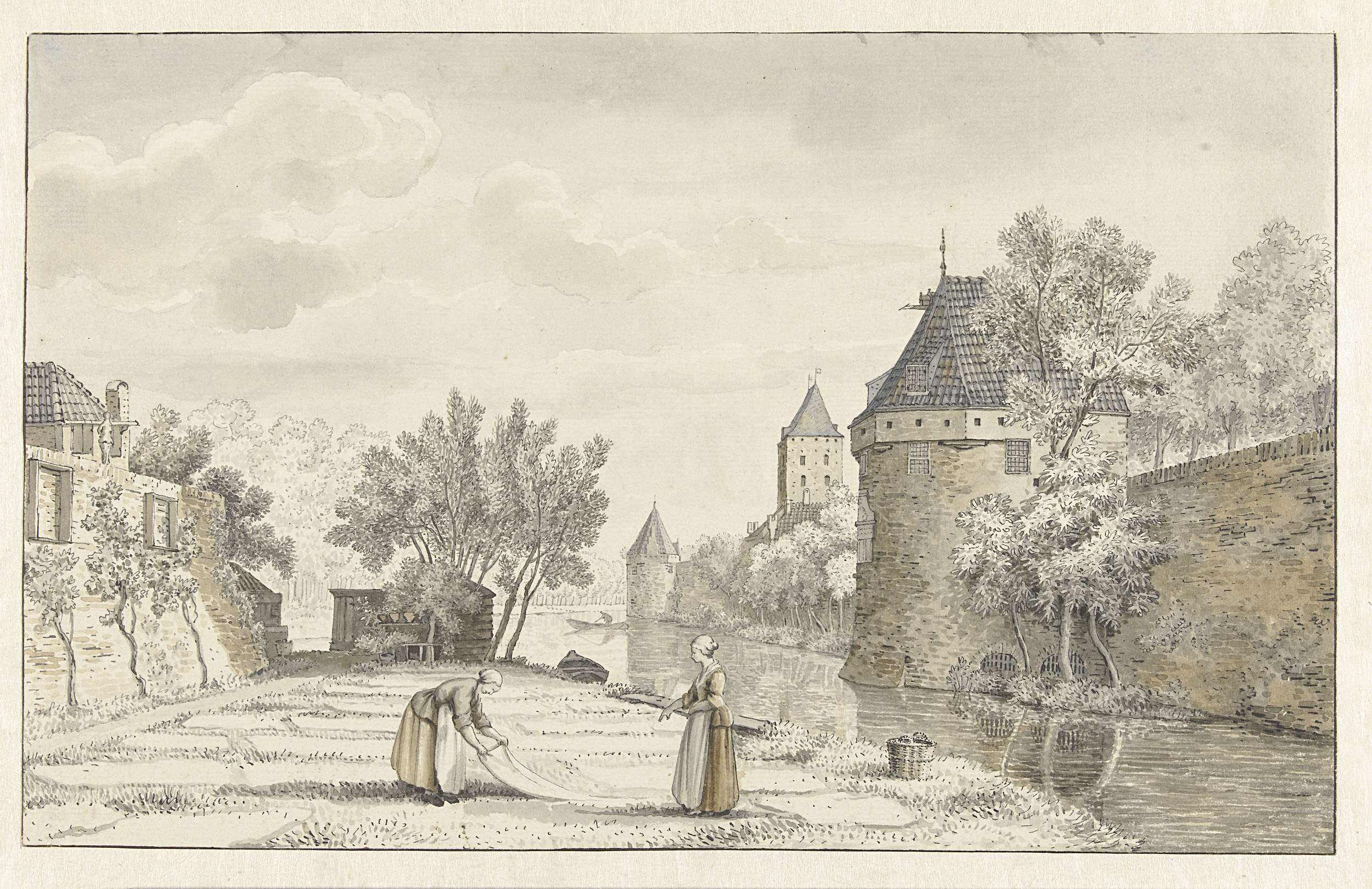 Gezicht op de muren en een ophaalbrug van een stad