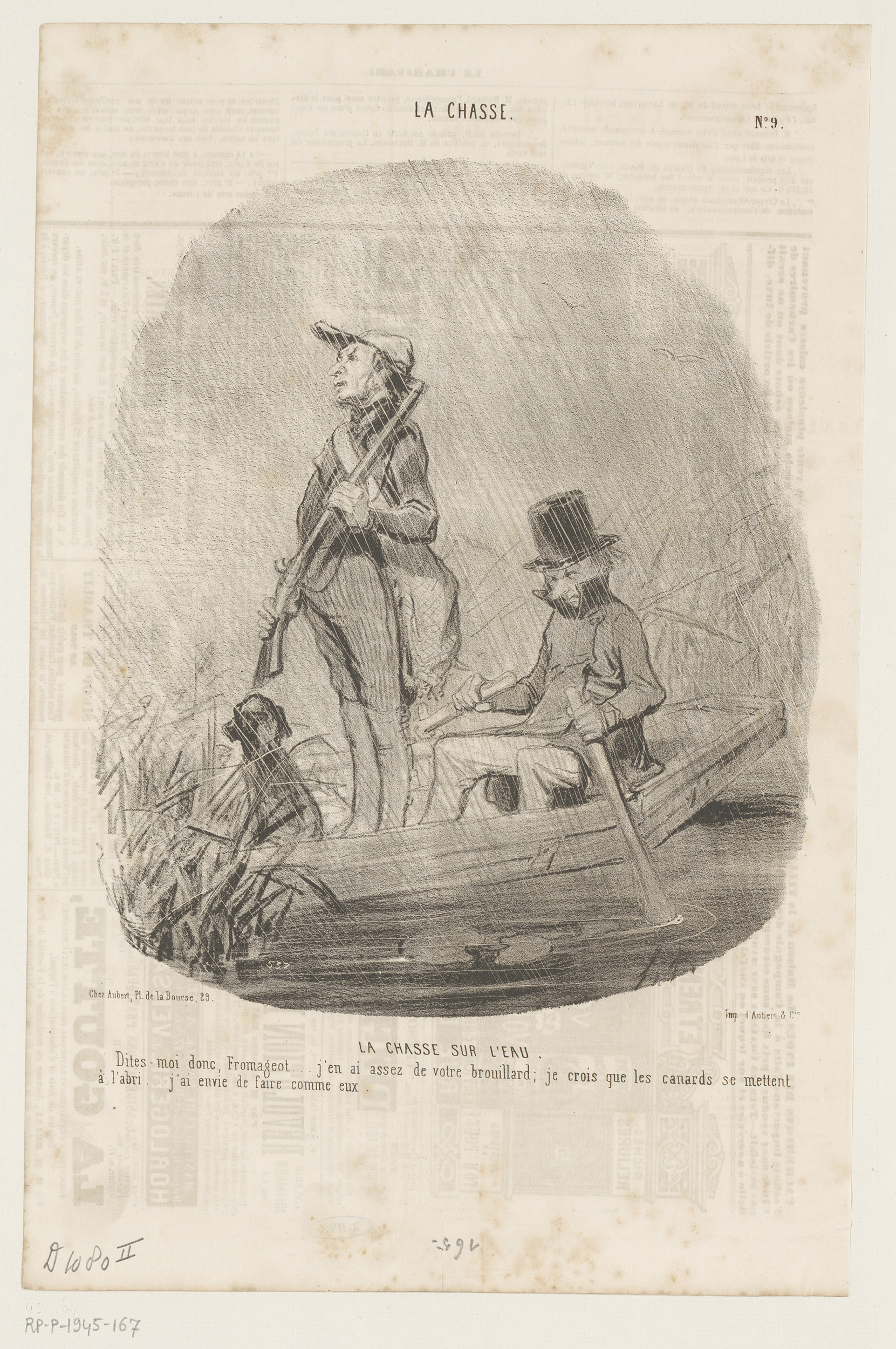 Karikatuur van twee jagers op een boot in de regen