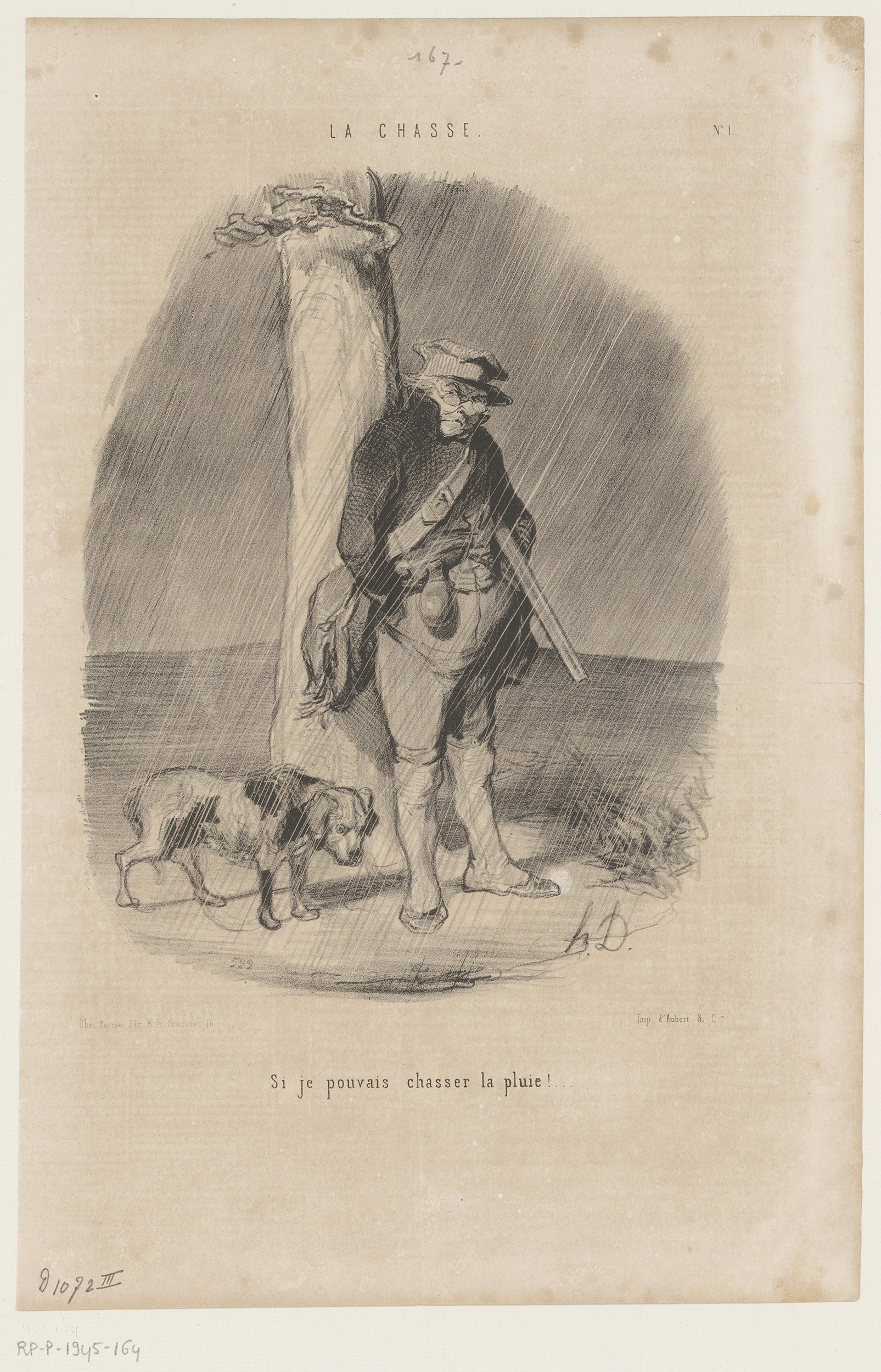 Karikatuur van een jager in de regen