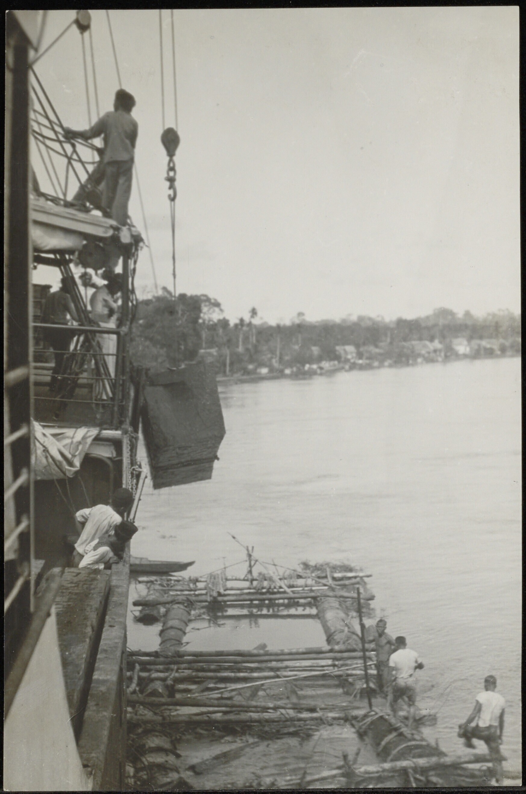 Arbeiders laden een schip met hout vanaf een vlot me...
