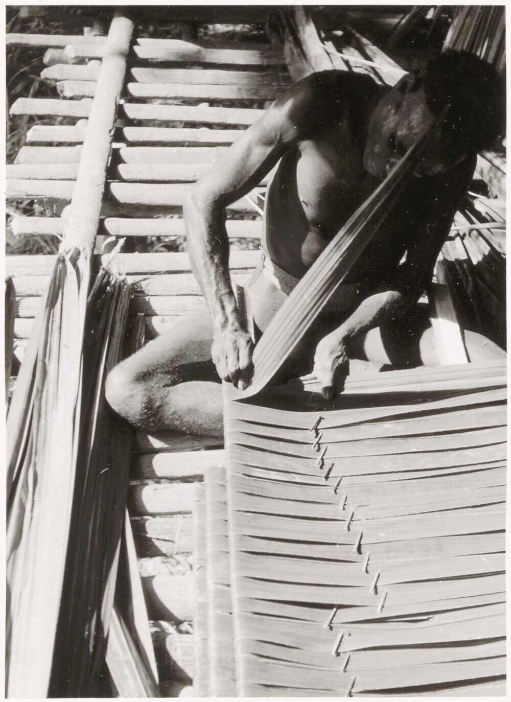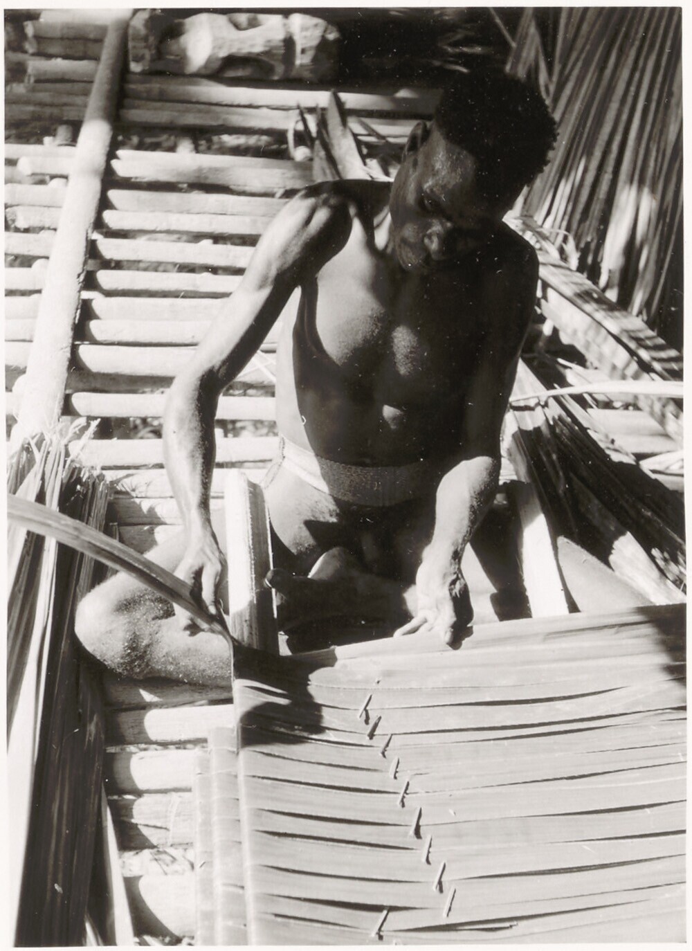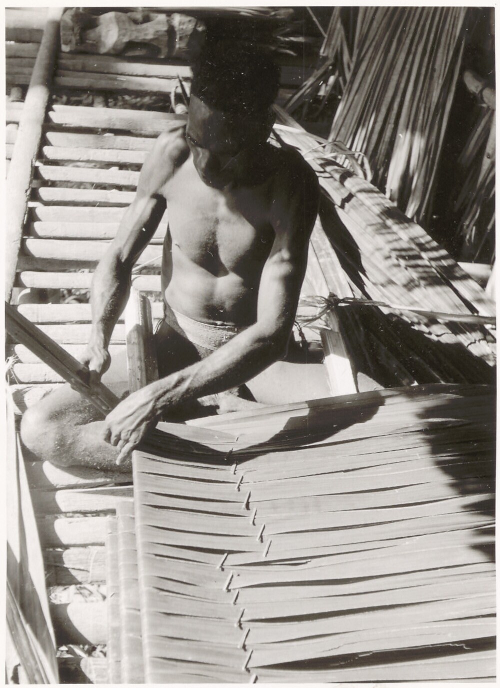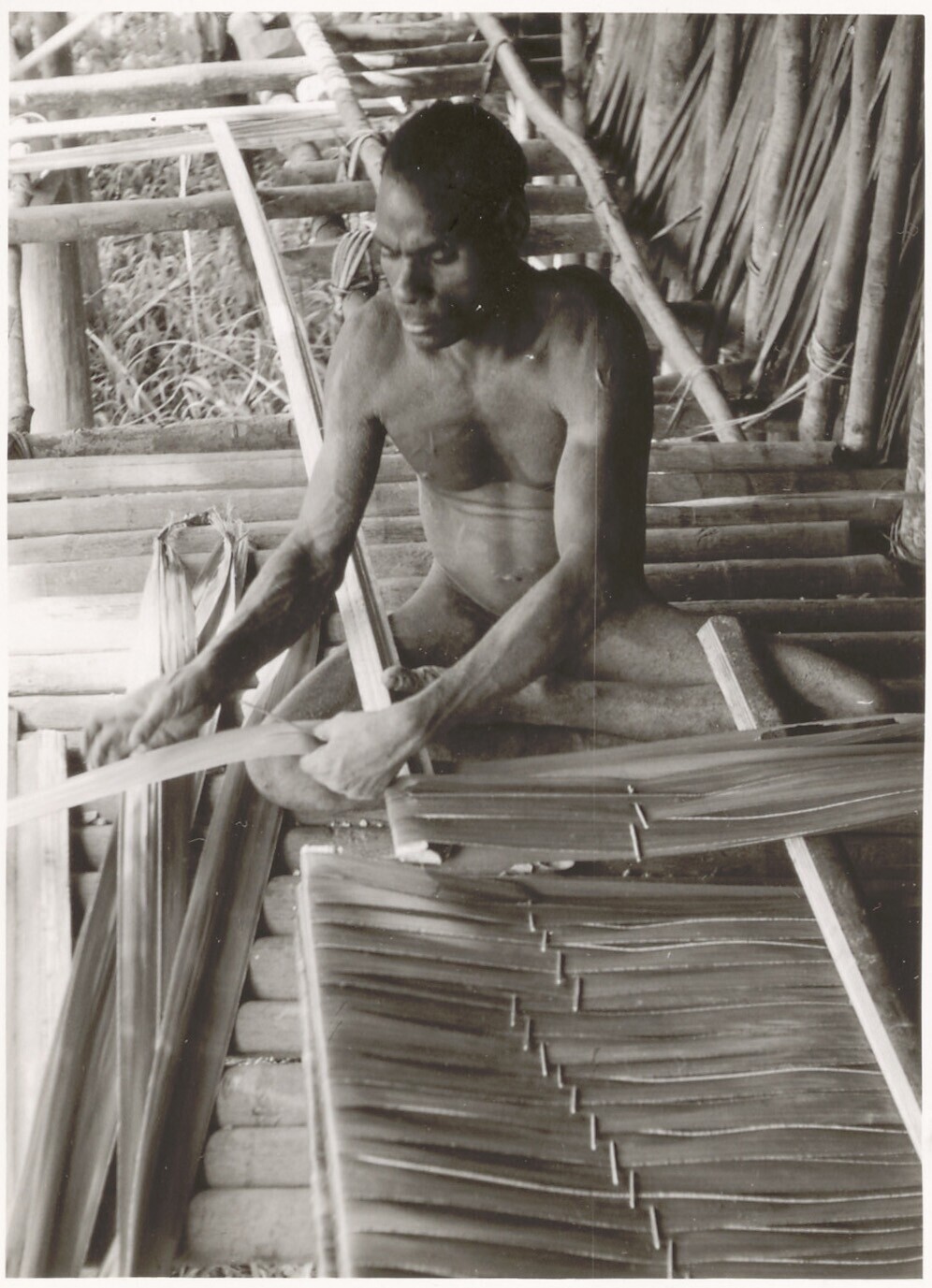 Itjürparquertji werkend aan zijn bootsteven in het d...