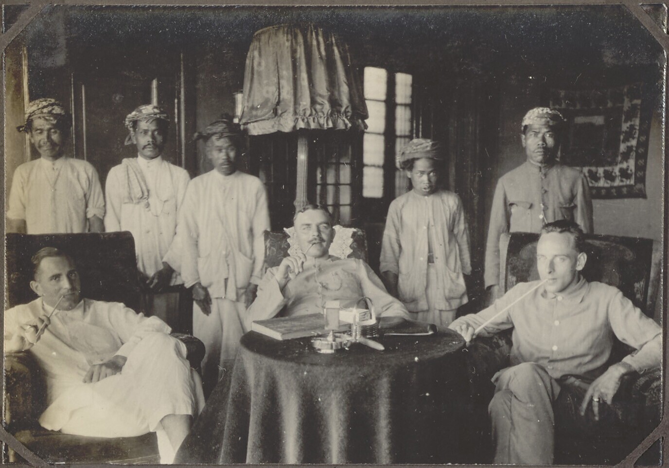 Portret van drie mannen in interieur, op de achtergr...