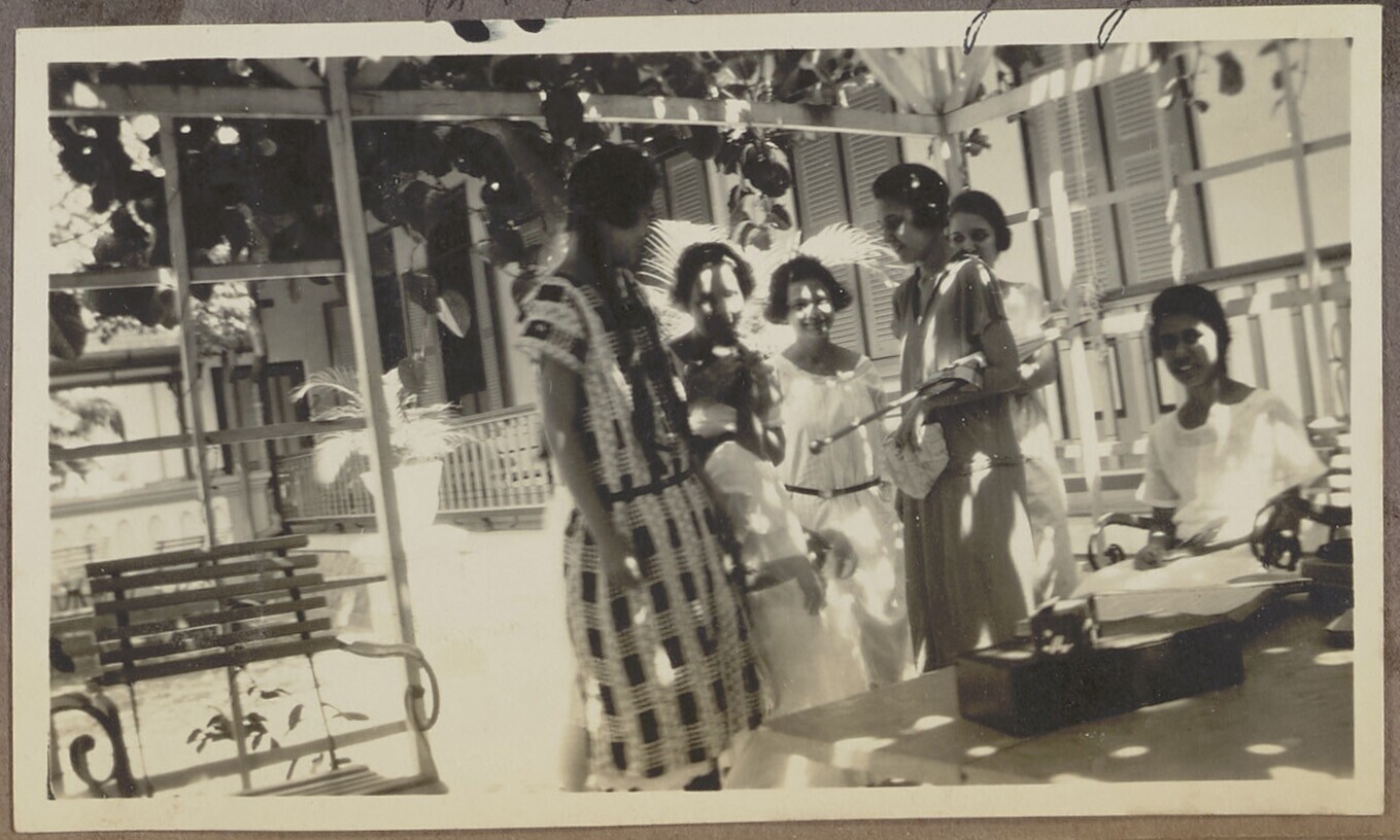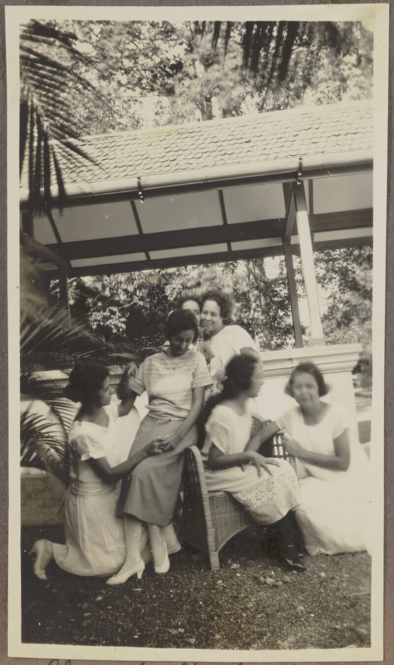 Groep van zes vrouwen zittend voor een balustrade