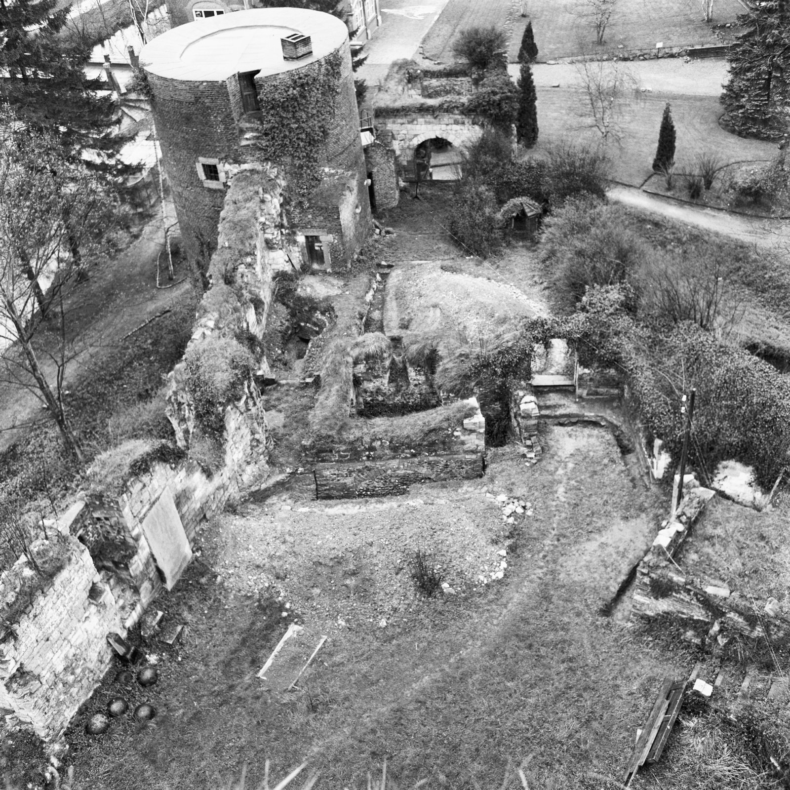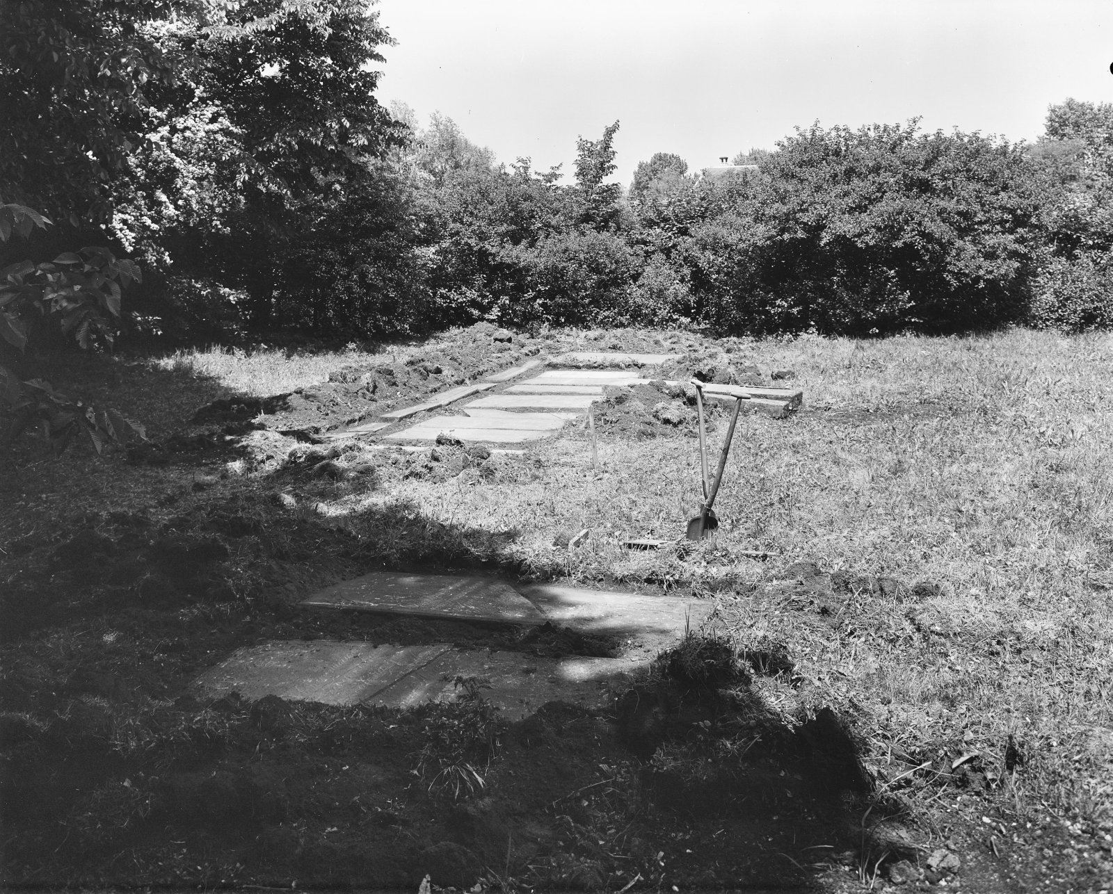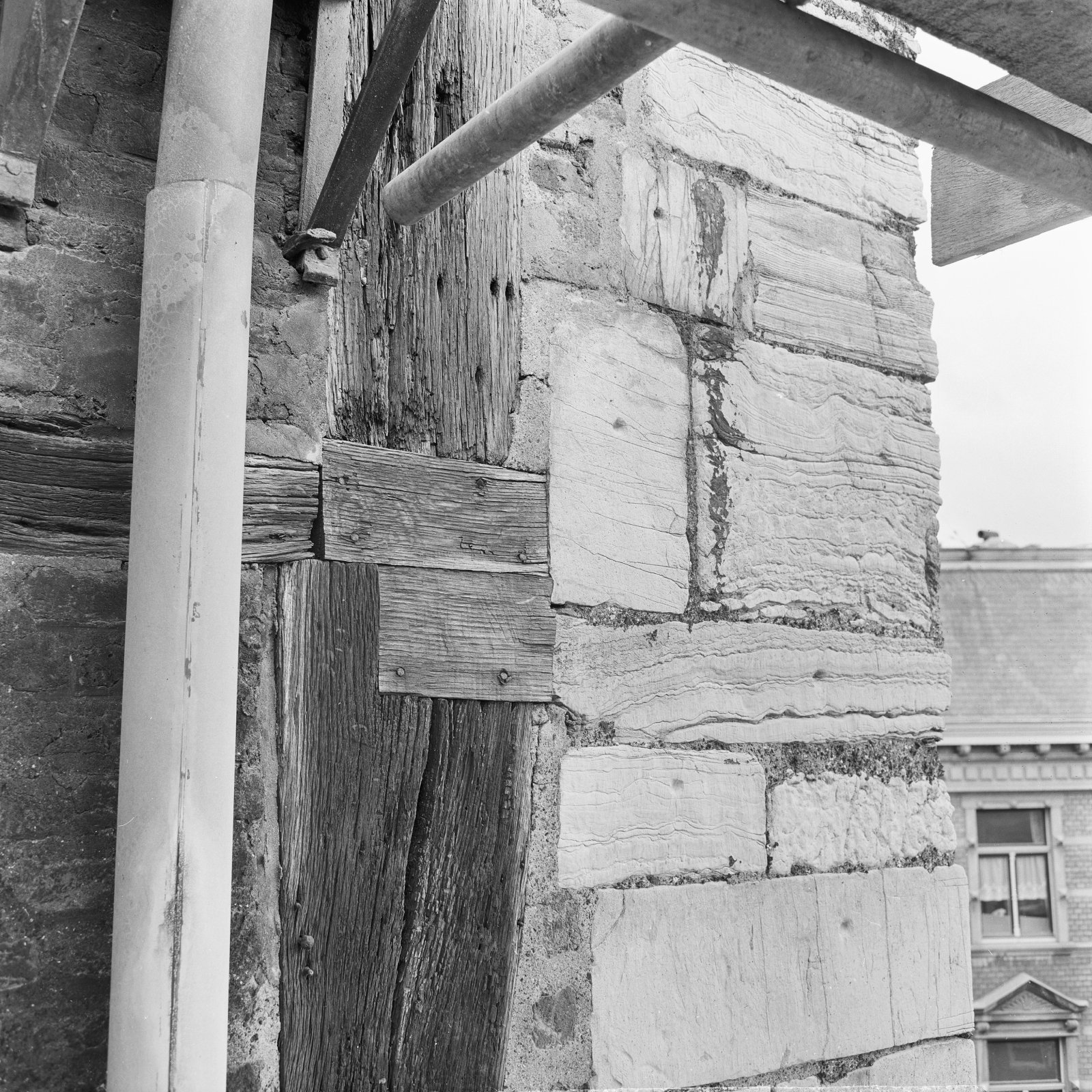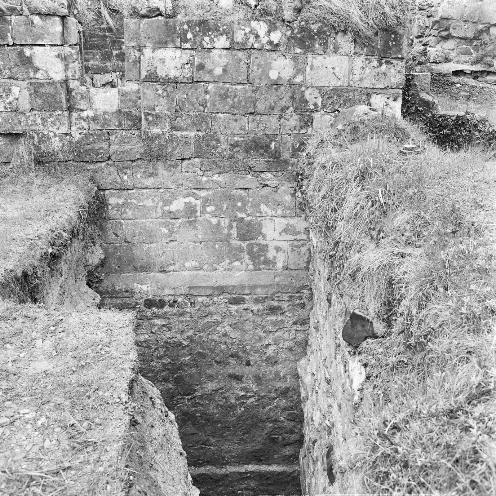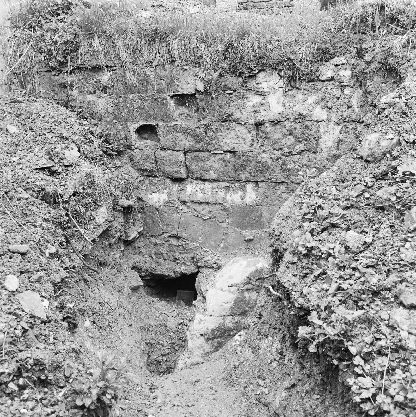 Opgraving dwarsmuur tegen weergang in noordwest hoek...