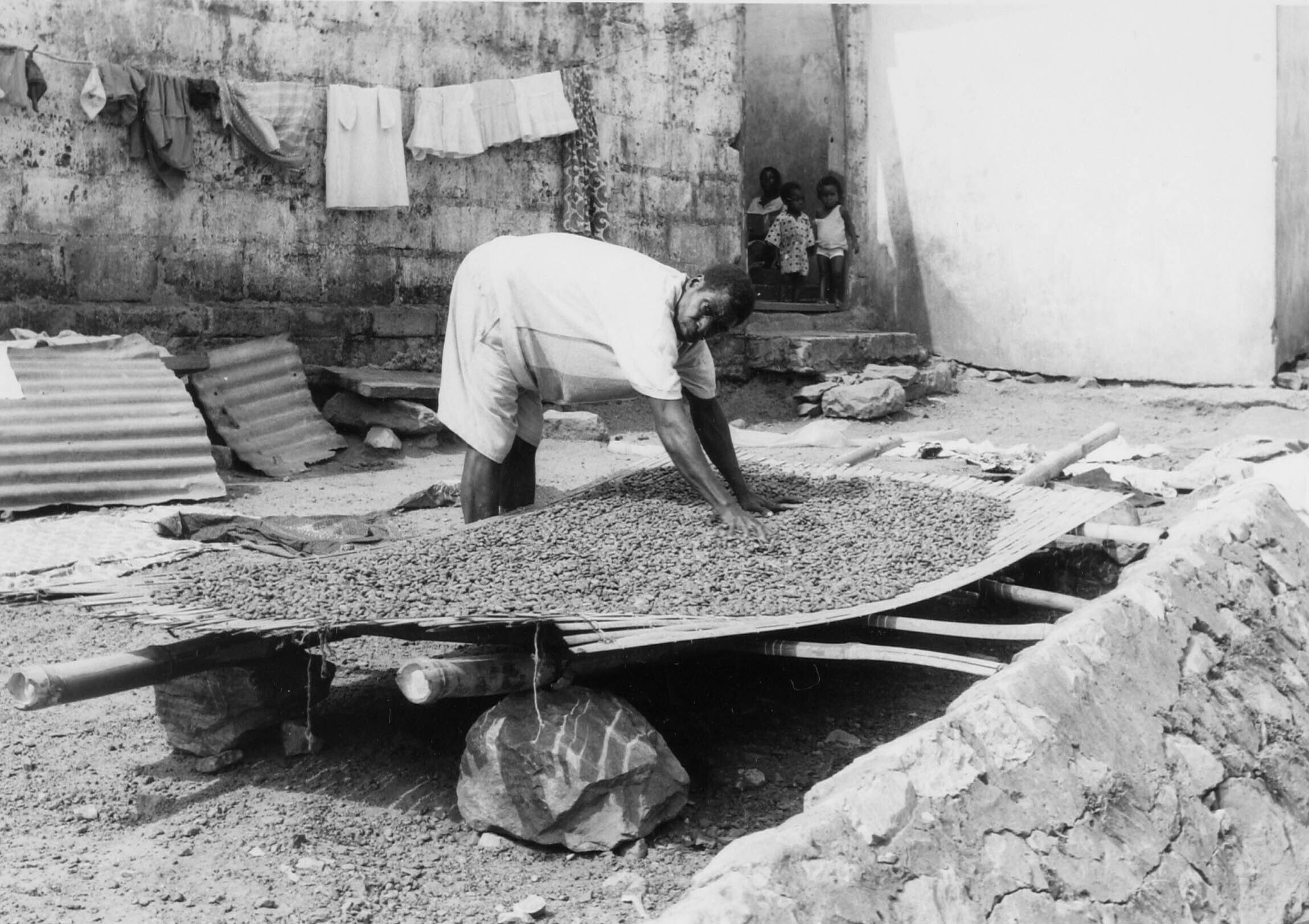 Akwapim Hills. Het drogen en keren van cacaobonen