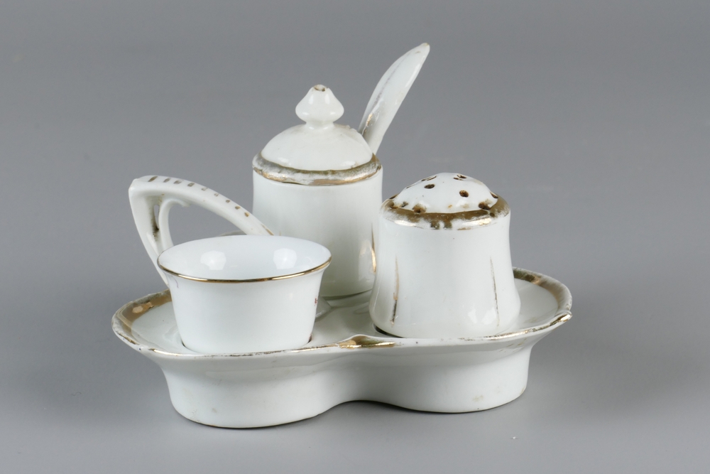 peper en zoutstel met mosterdvaatje en lepeltje op s...
