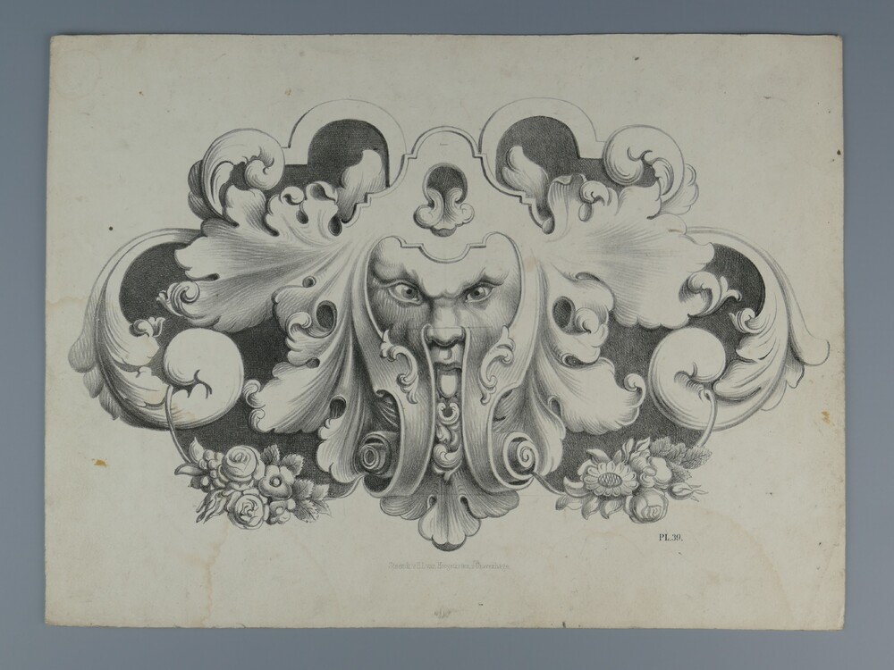 Litho, voorstellende floraalmotief met gezicht, circ...