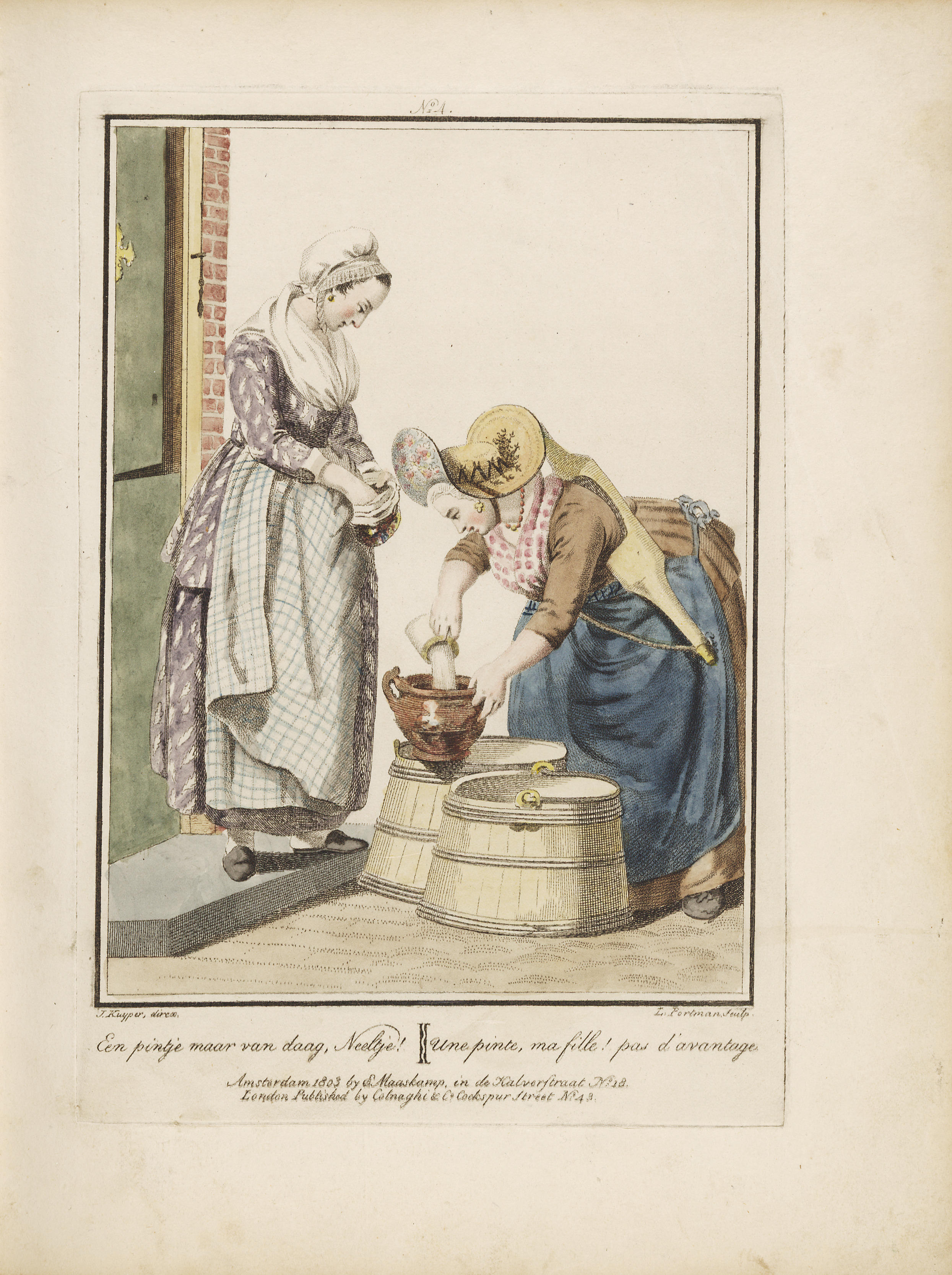 Dienstmeisje en melkverkoopster aan de deur (gravure)