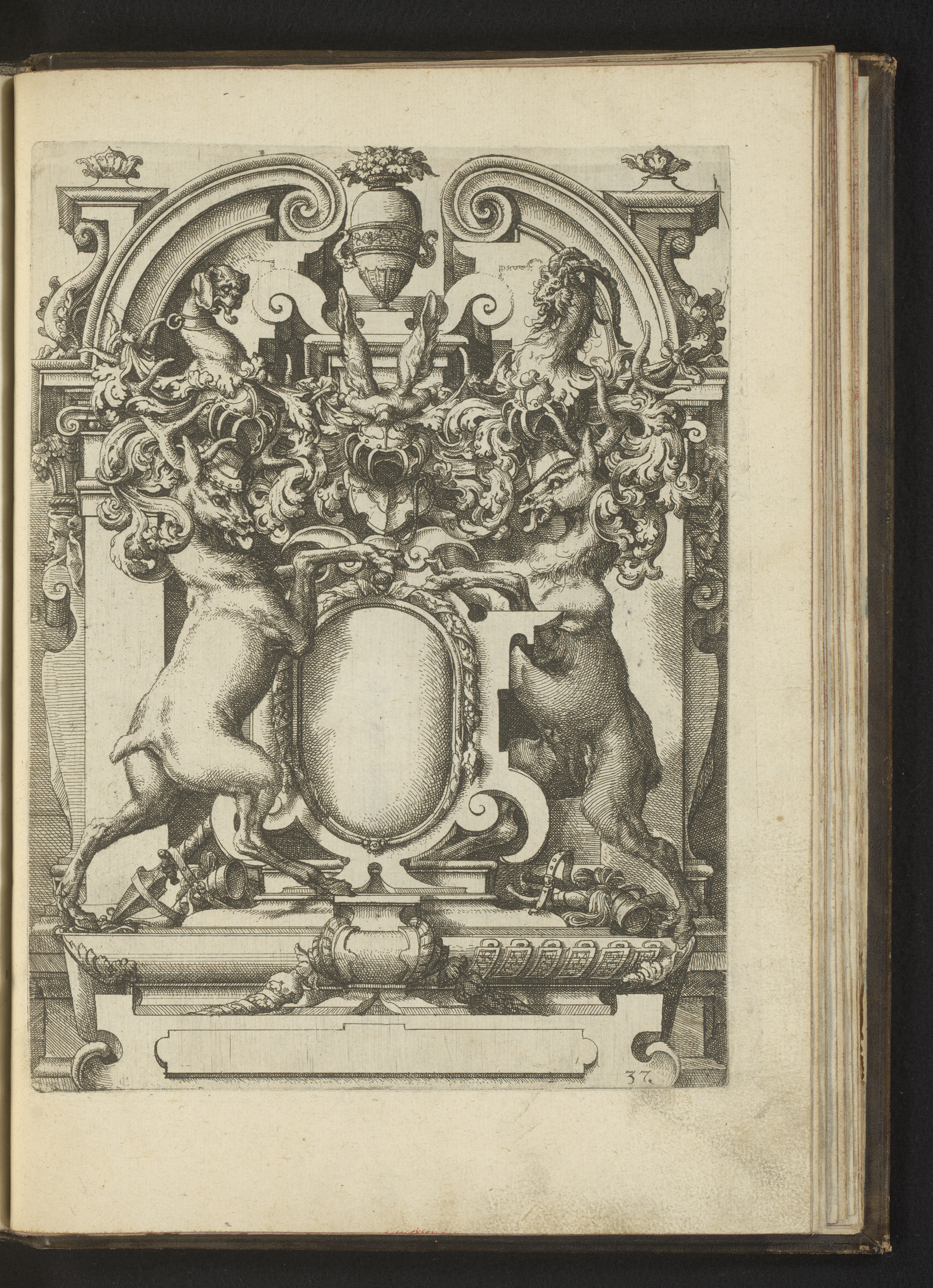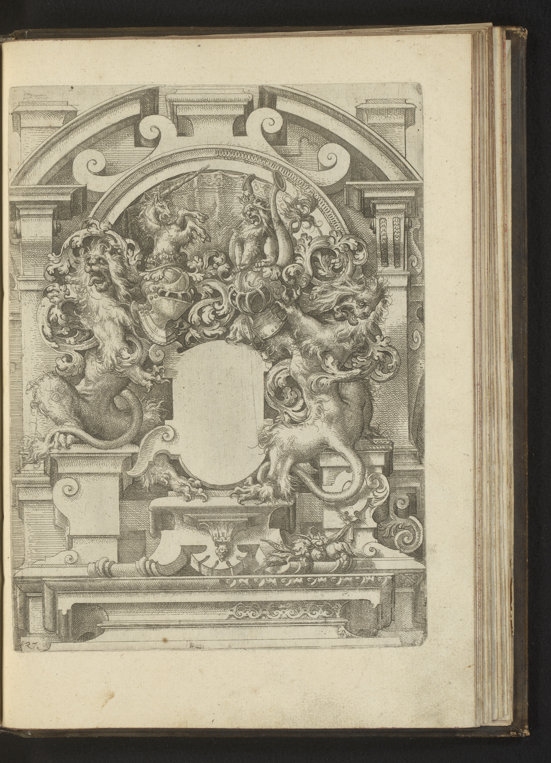 Cartouche op een sokkel geflankeerd door leeuwen en ...