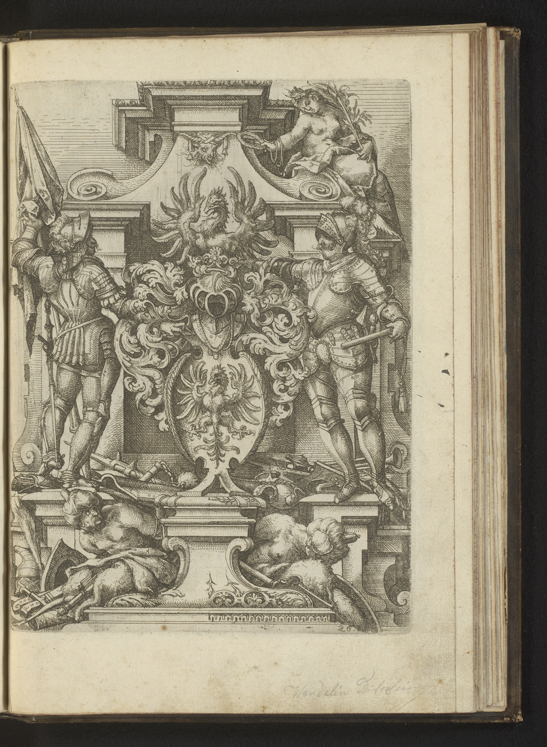Wapenschild op een sokkel geflankeerd door twee sold...