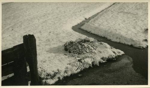 Foto in zwart-wit van gezonken schouw in het ijs bij...