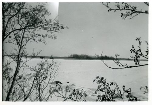 Foto in zwart-wit van een winterlandschap met weilan...