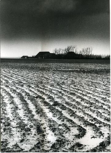 Foto in zwart-wit van geploegde akkers met sneeuw do...