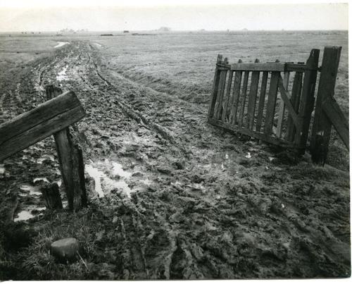 Foto in zwart-wit van een hek bij een modderig pad d...