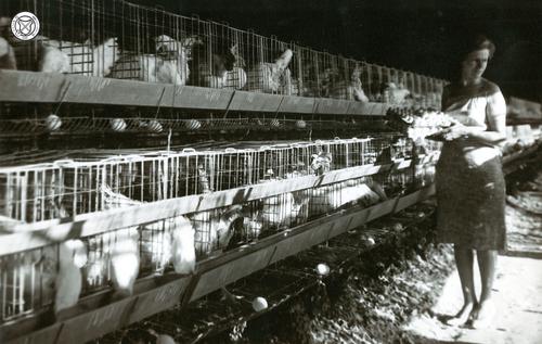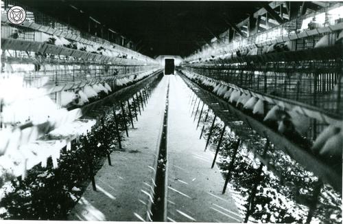 Schuur met leghennen in kooien