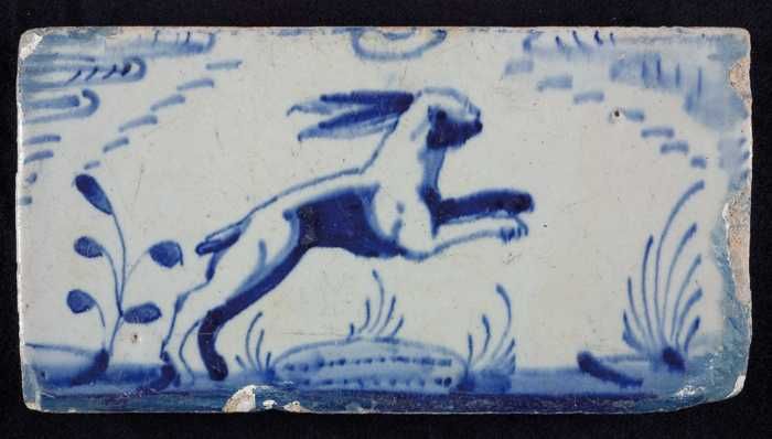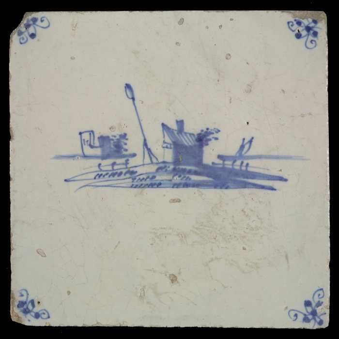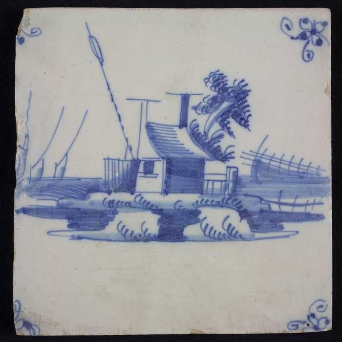 Tafereeltegel, blauw, vuurbaak en woning, hoekmotief...