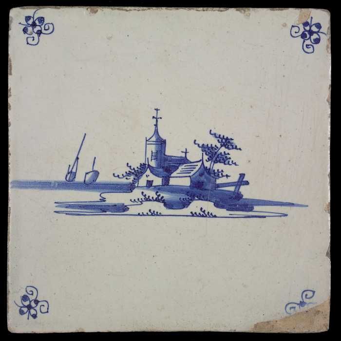 Tafereeltegel, blauw, dorp en kerk, hoekmotief spin