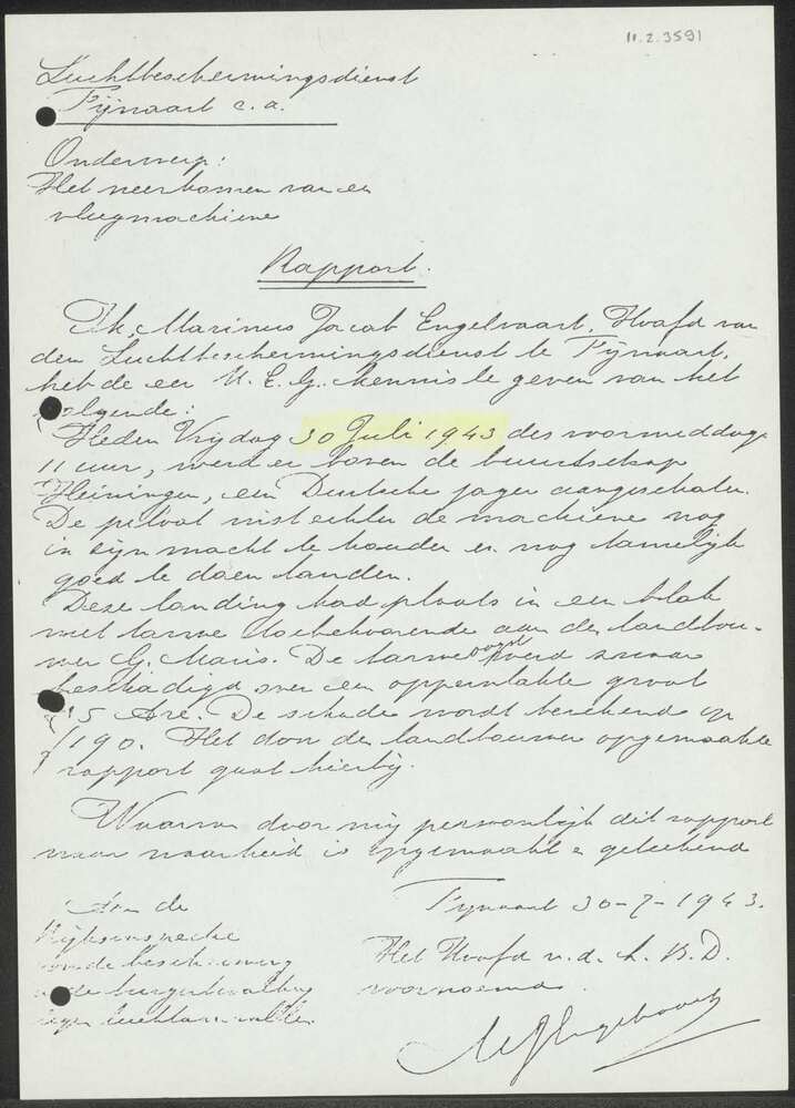 Rapport Luchtbeschermingsdienst Fijnaart, 30 juli 1943.