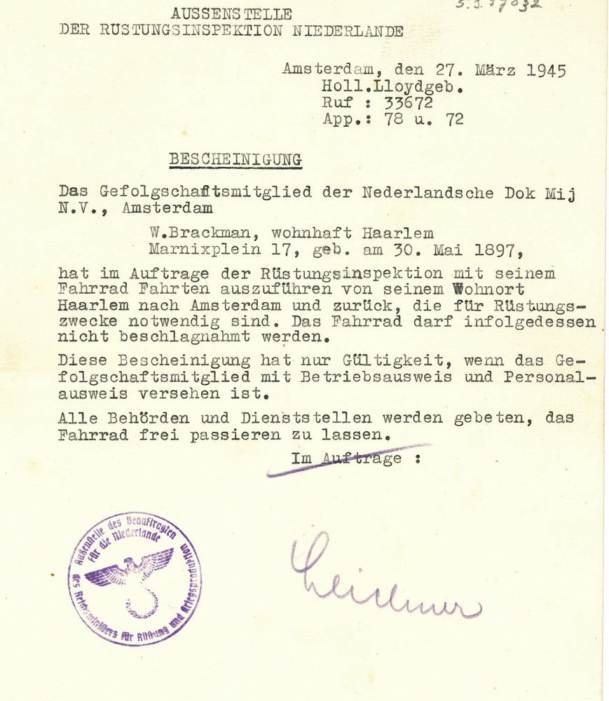 Bescheinigung, Das Gefolgschaftsmitglied der Nederla...