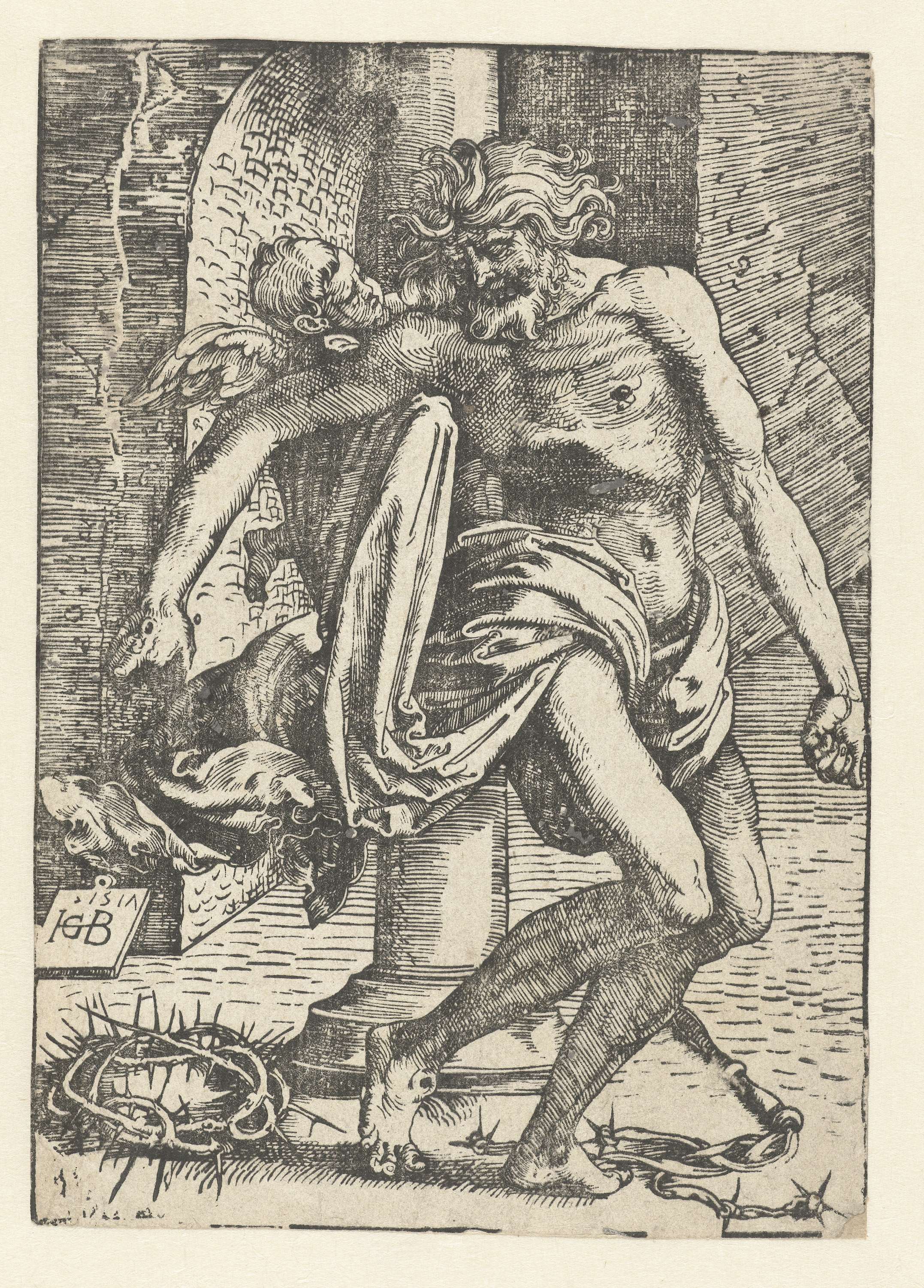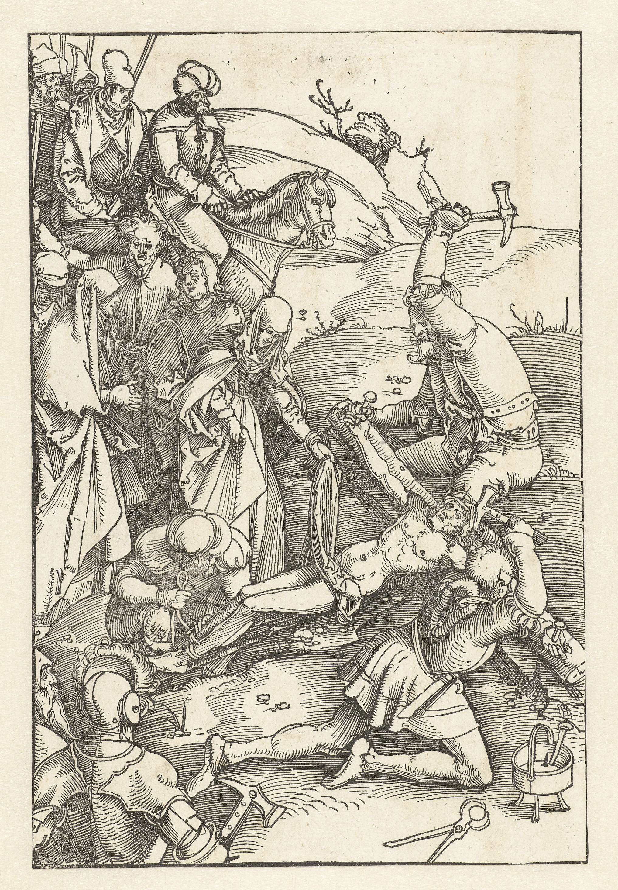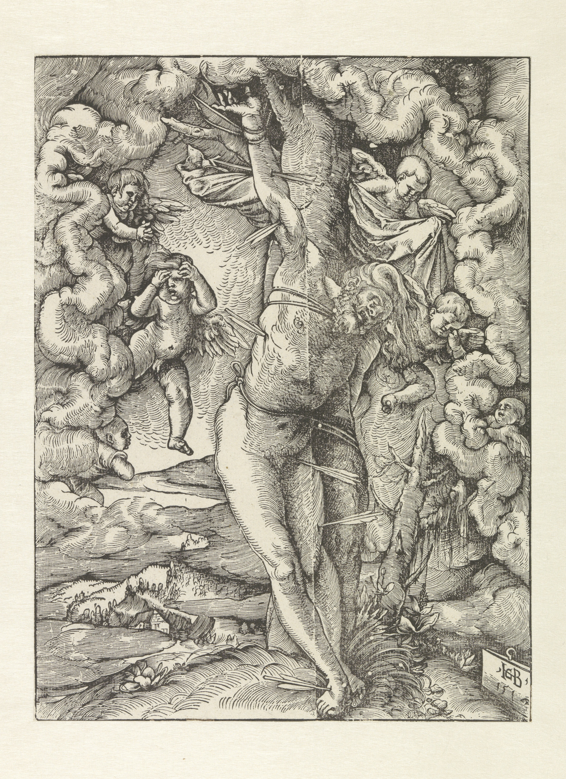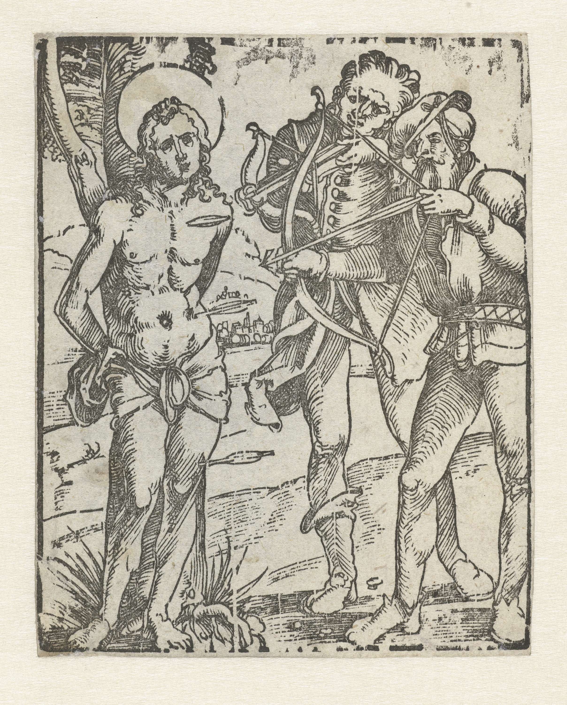 Sebastiaan vastgebonden en met pijlen in zijn lichaam