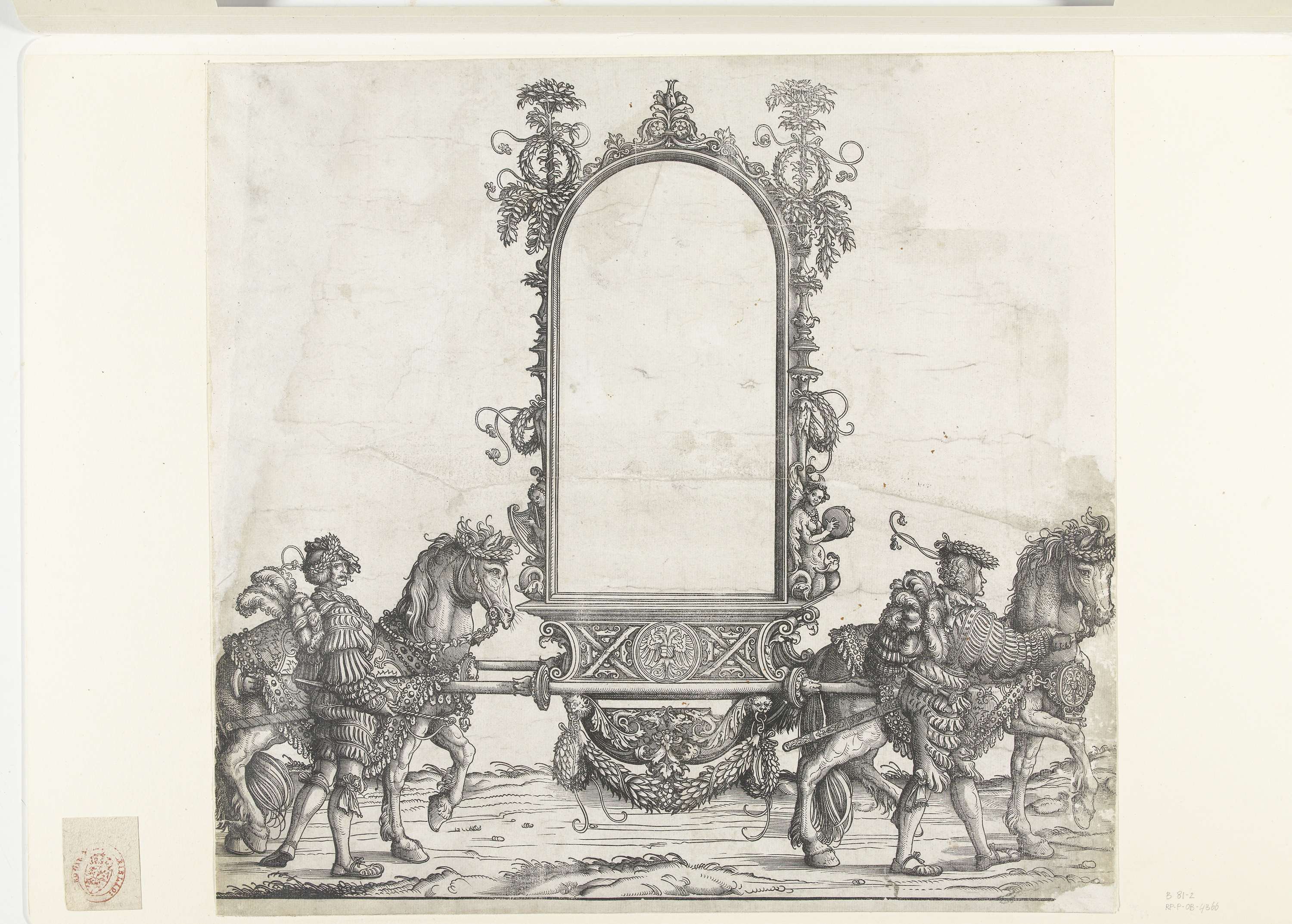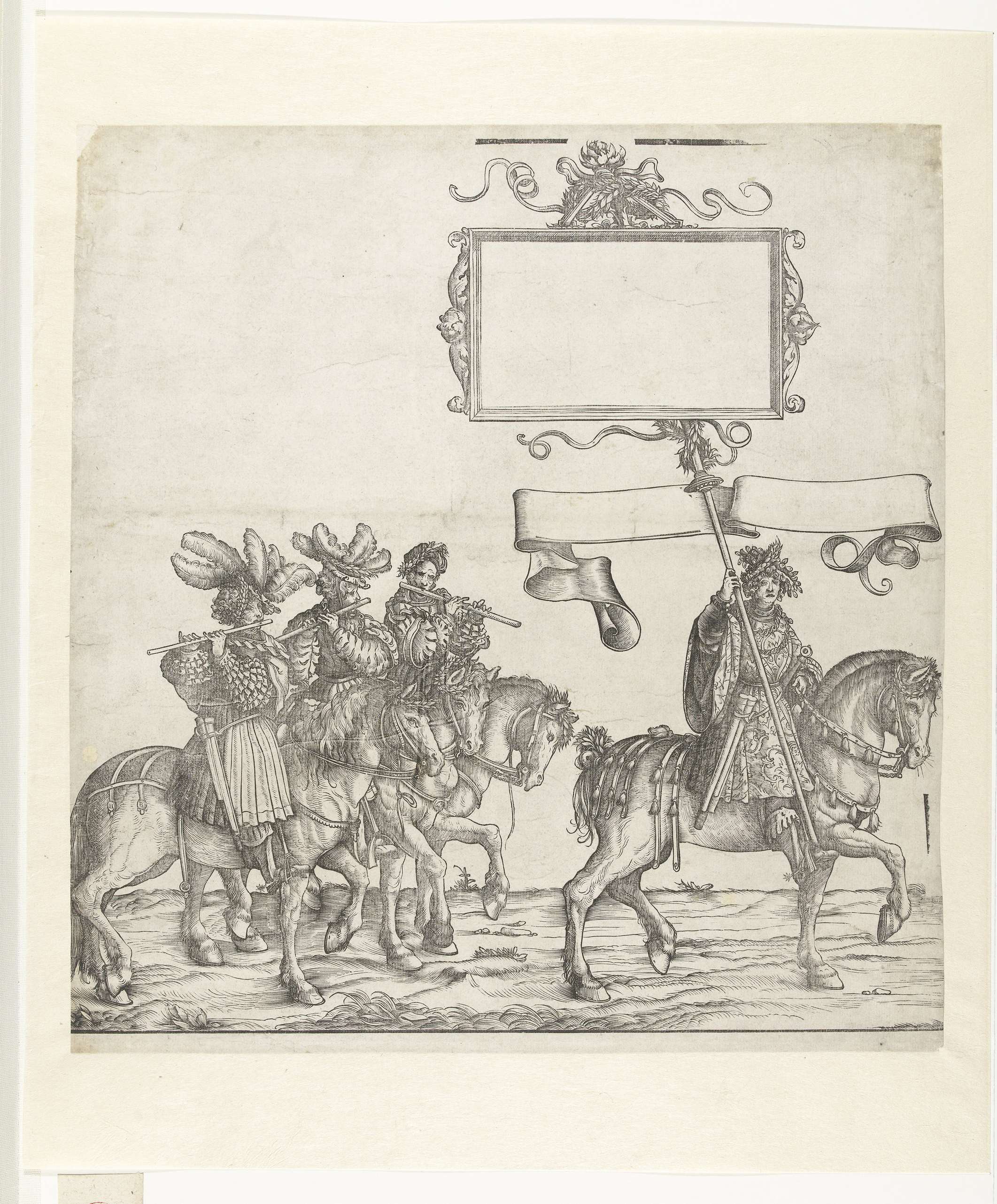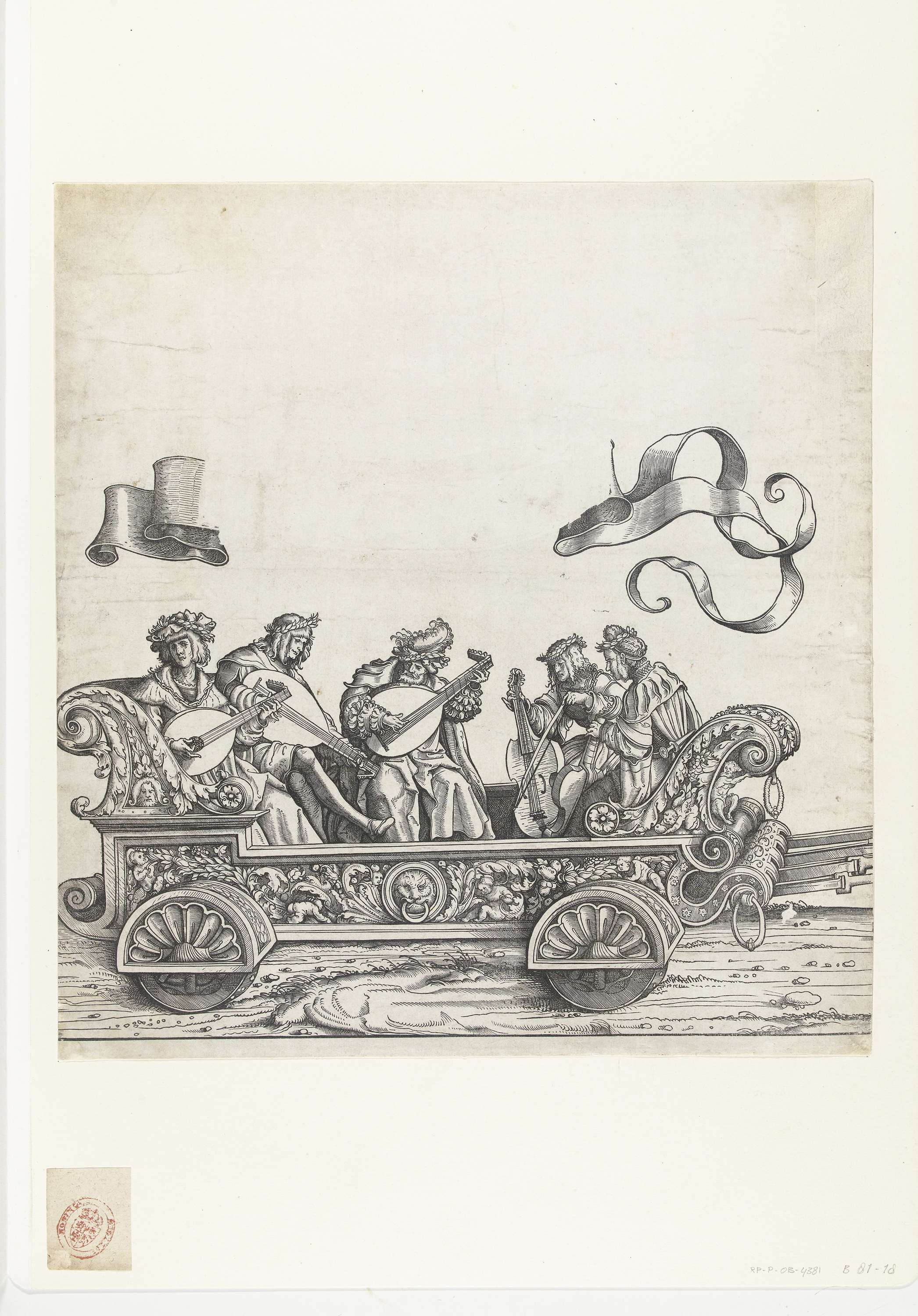 Triomfwagen met musici die spelen op blaasinstrumenten