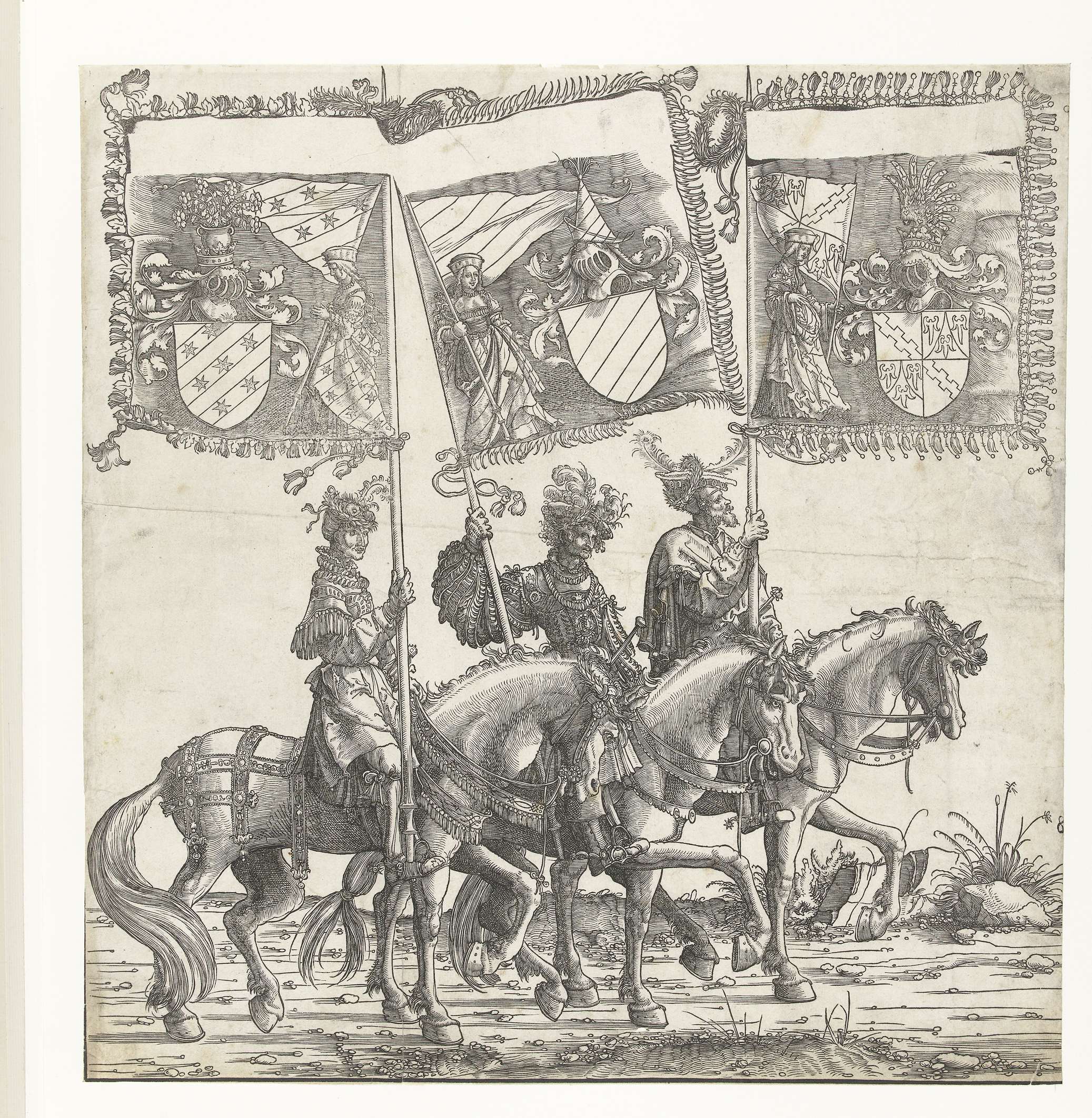 Drie mannen te paard dragen de Oostenrijkse vaandels...