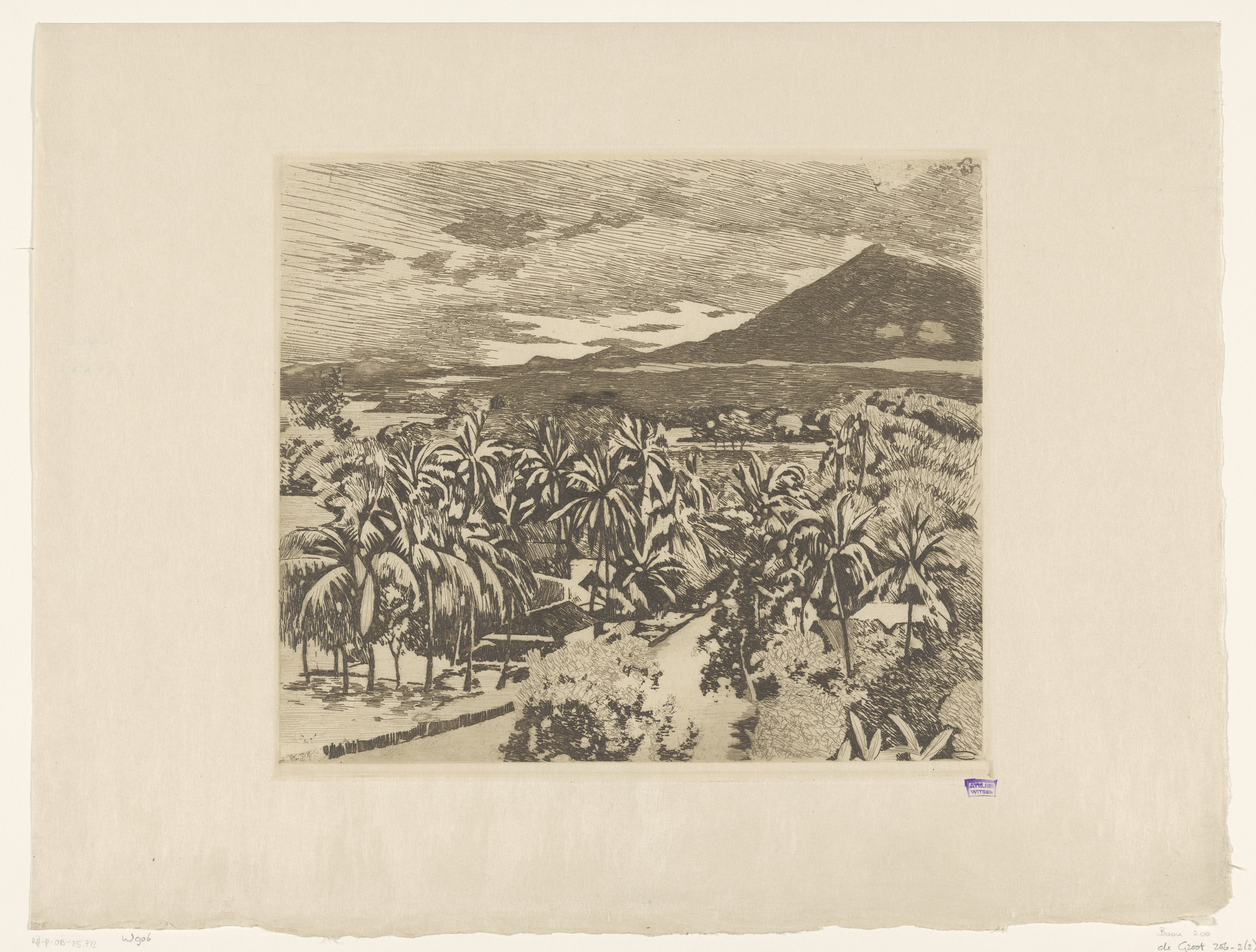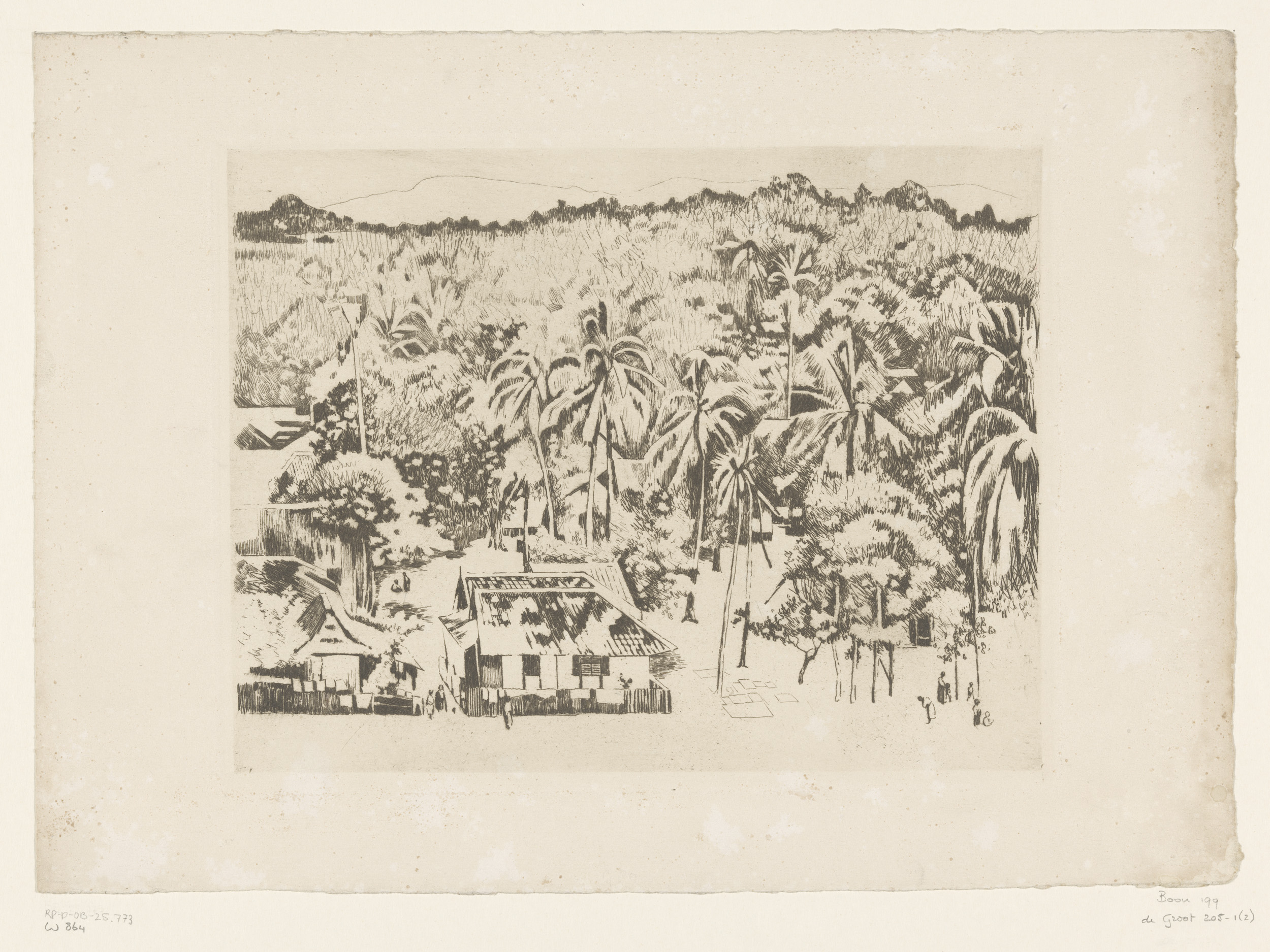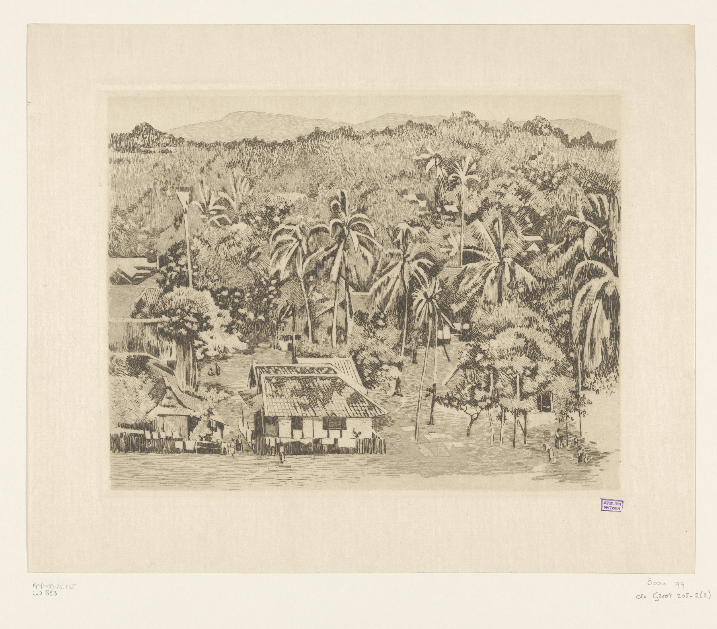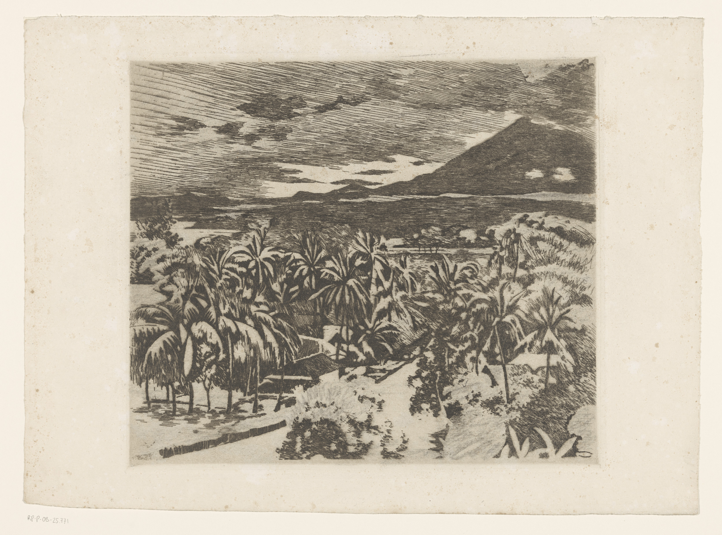 Gezicht op een landschap met klapperbomen in Buitenzorg