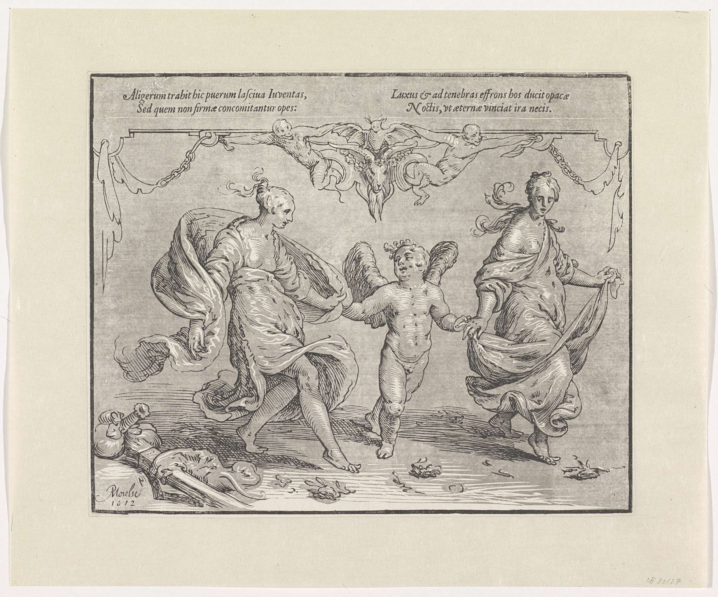 Cupido danst met twee allegorische vrouwfiguren