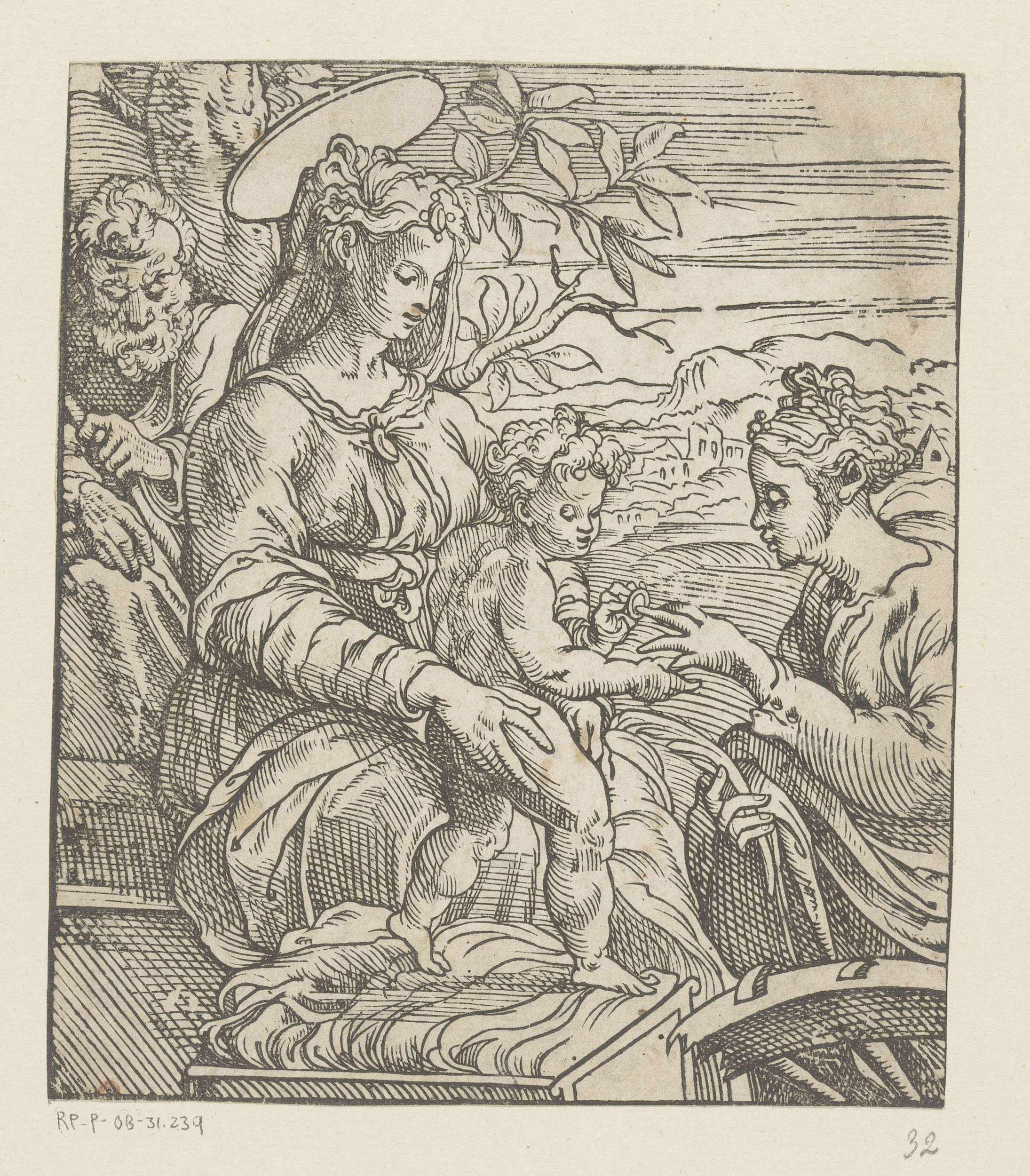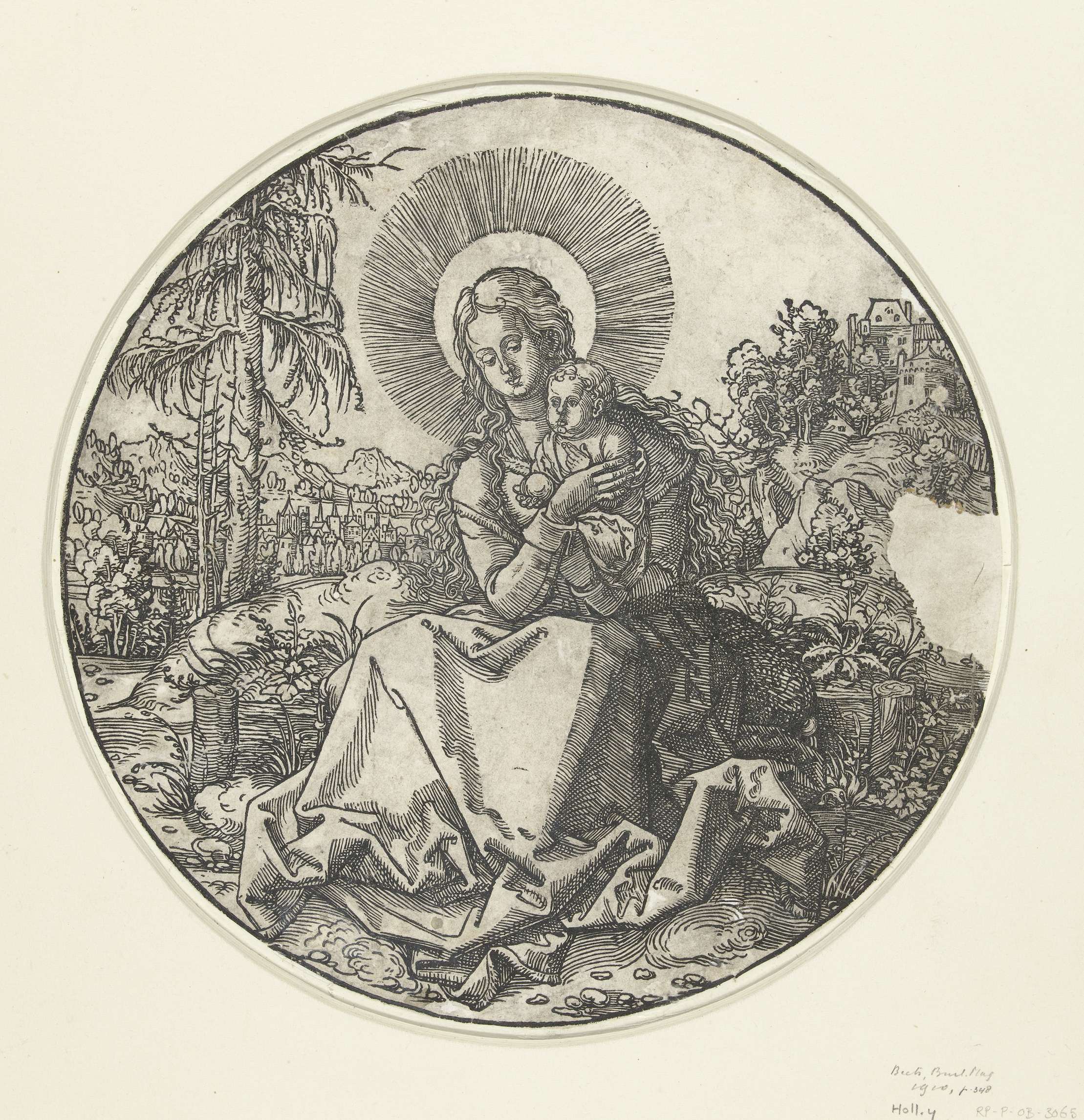 Zittende Madonna met kind in een landschap