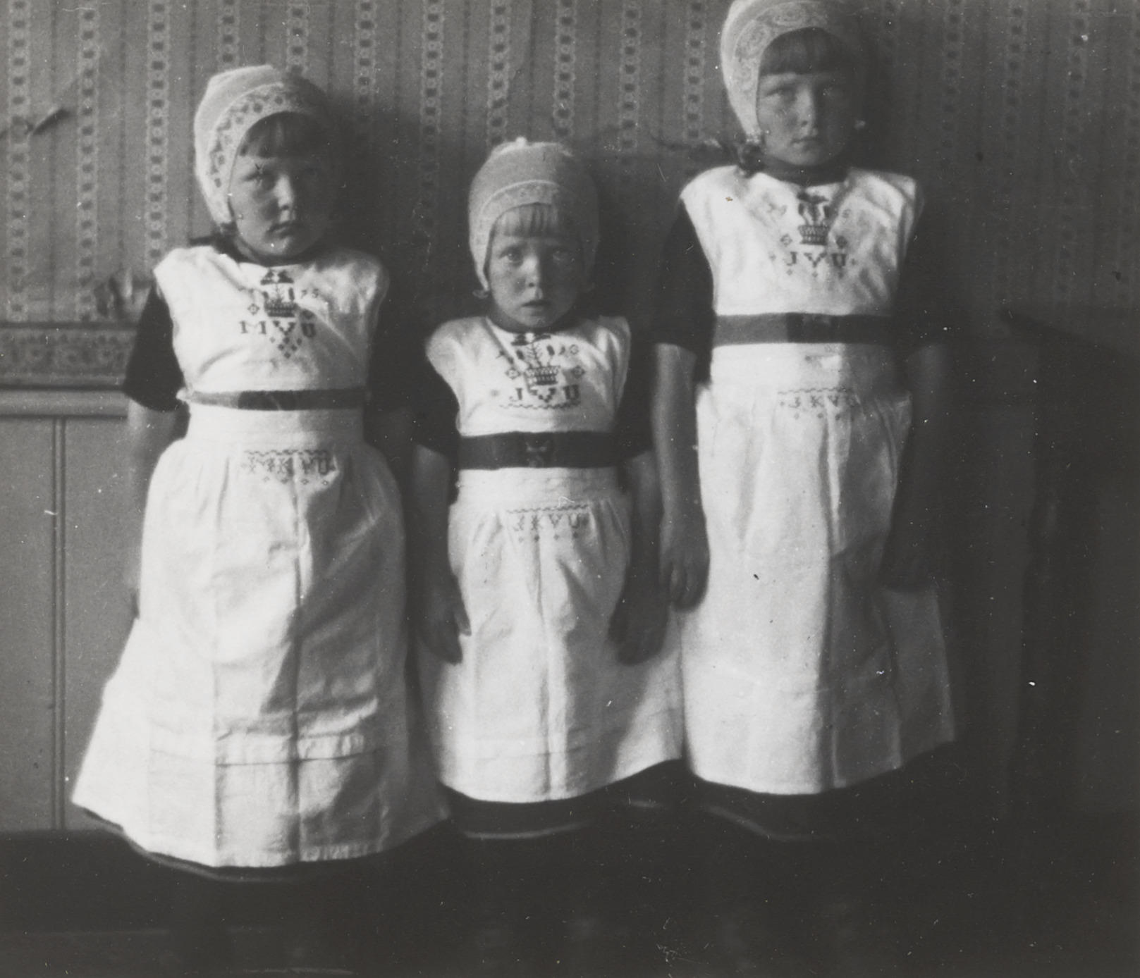 Drie meisjes in Urker dracht, circa 1916 (zwart-wit ...