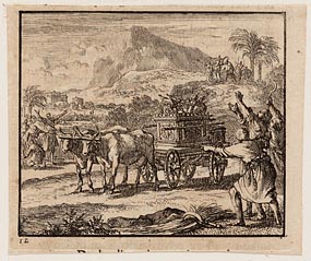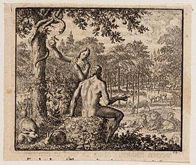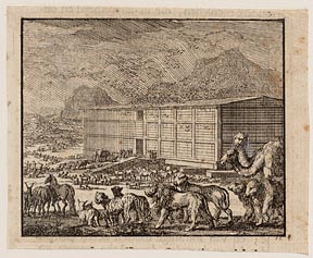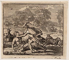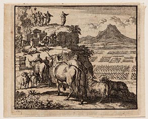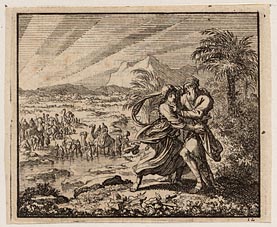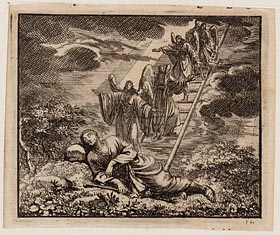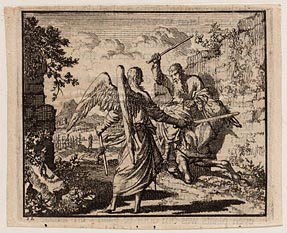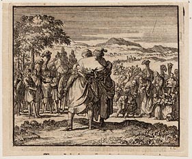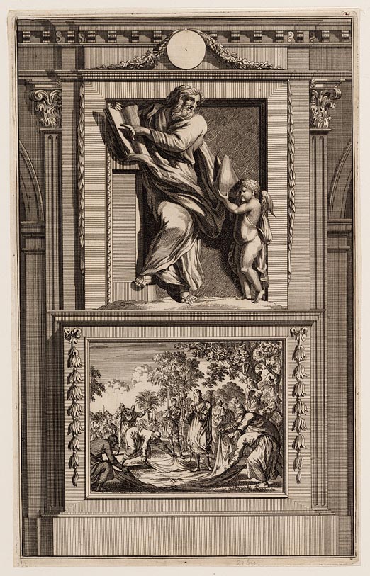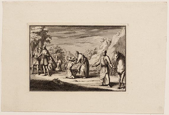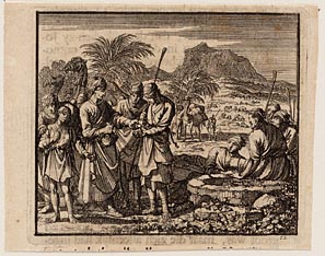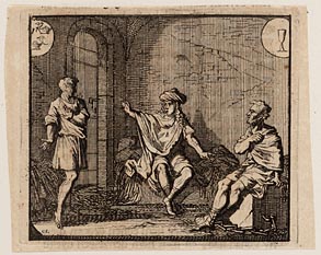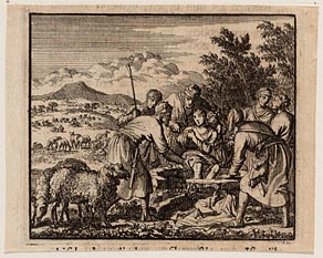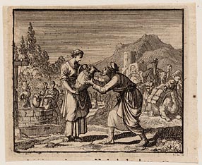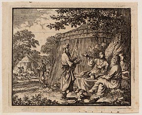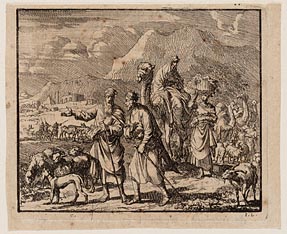 Abraham ontvangt drie engelen, Sara gluurt vanuit de...