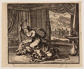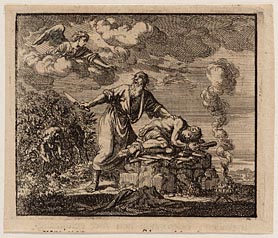Manoach en zijn vrouw knielen bij het altaar waarbov...