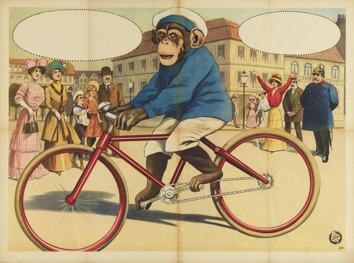 Chimpansee op rijwiel + straatbeeld