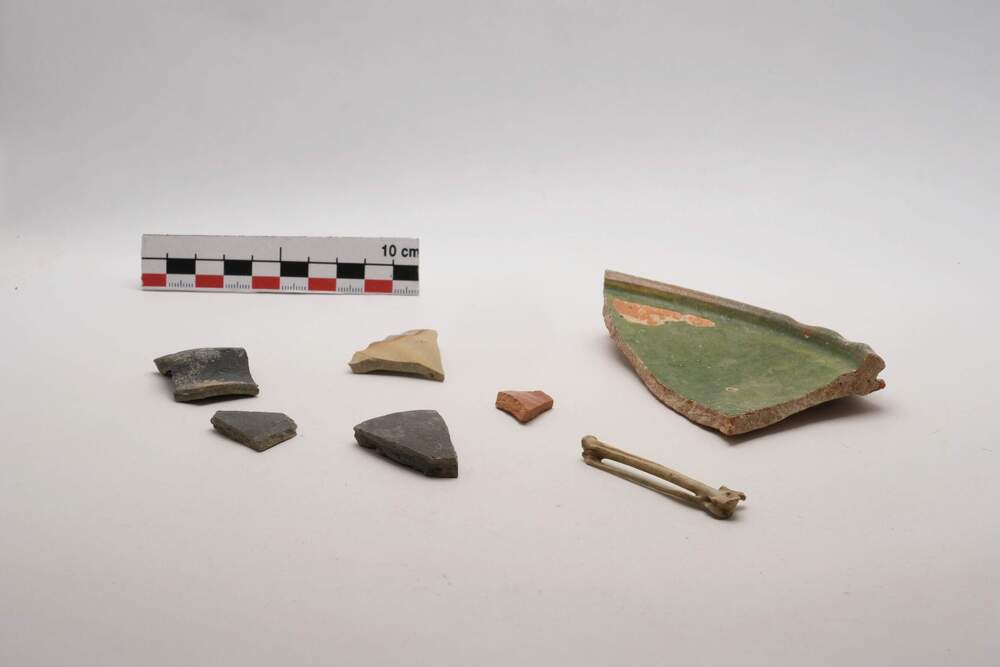 Fragmenten, steengoed/aardewerk/been/ijzer/schelp,