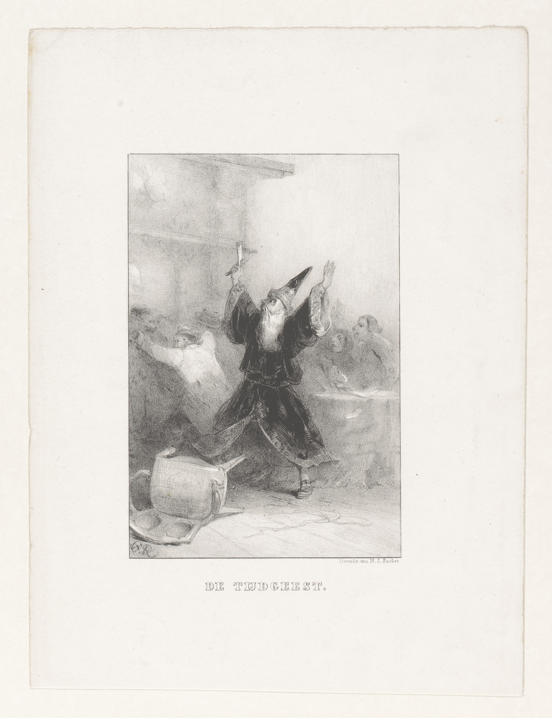 Oude man met puntmuts en geheven handen