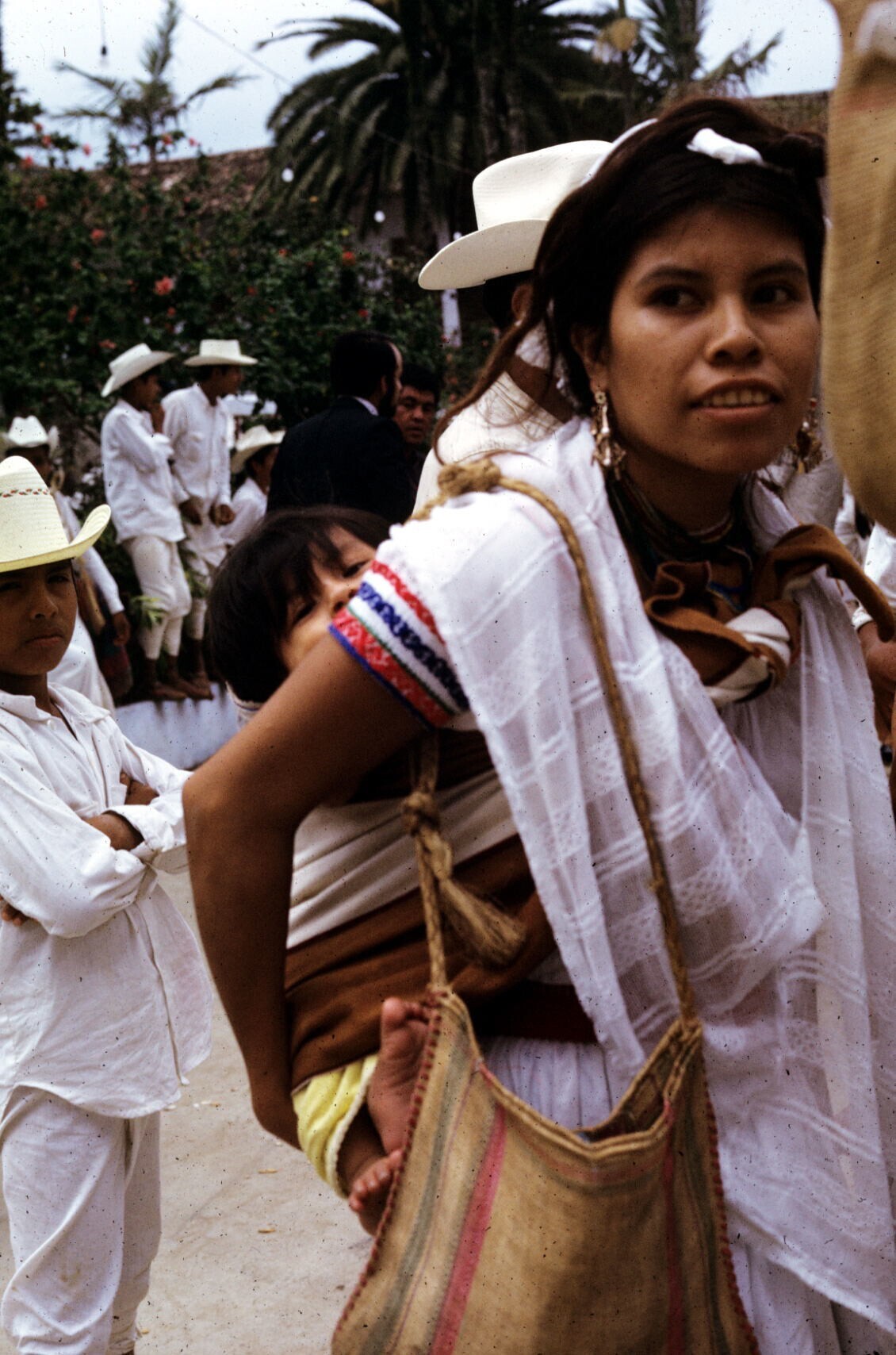 moeder, kind op rug dragend in "mamal"(draagdoek)