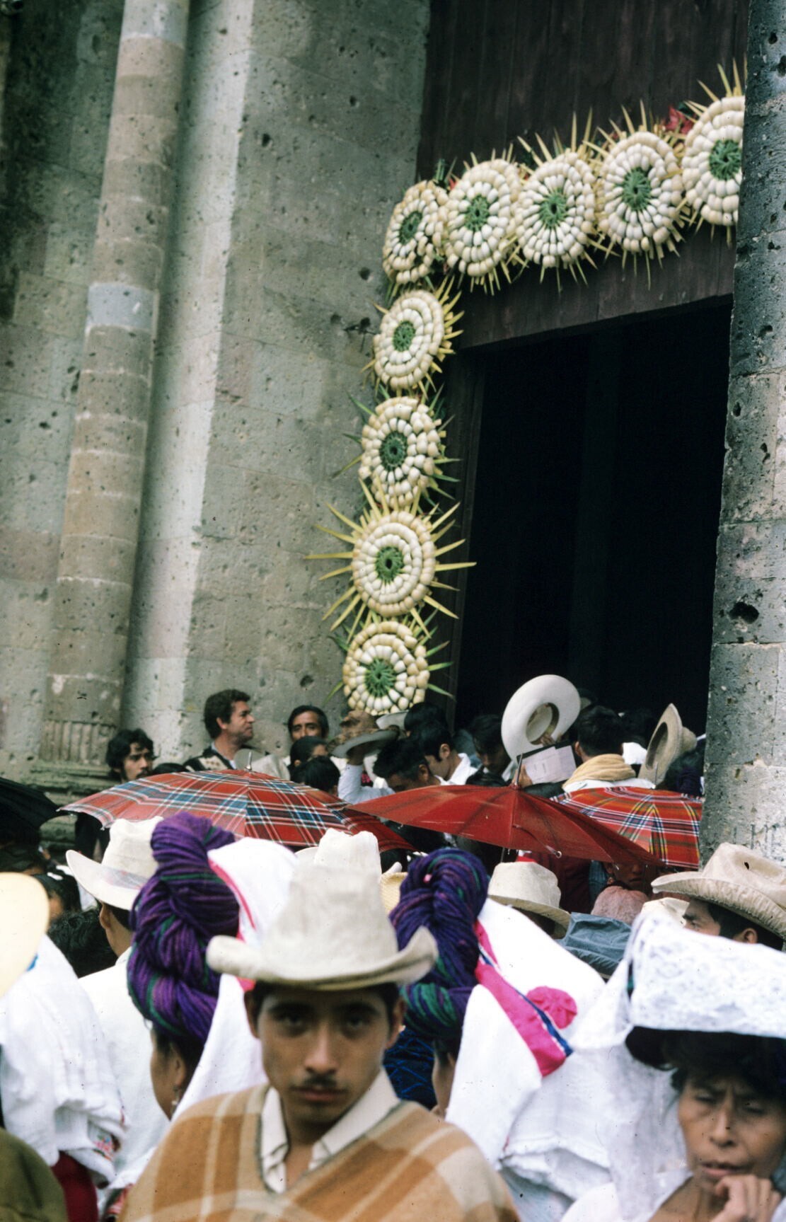 publiek met hoeden en paraplu's bij ingang kerk