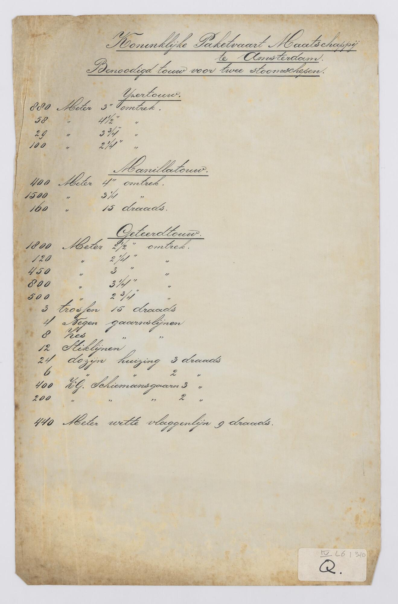 Benodigd touw voor twee stoomschepen voor de vracht-...