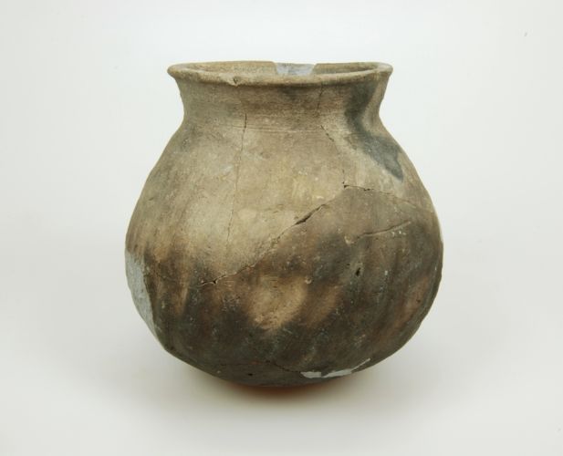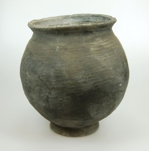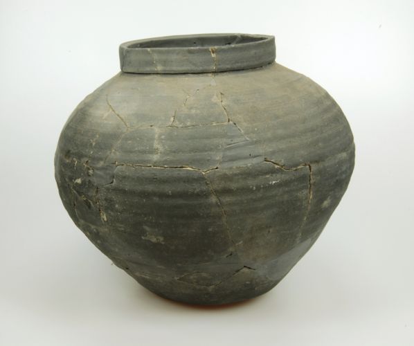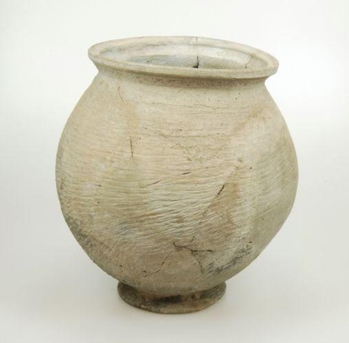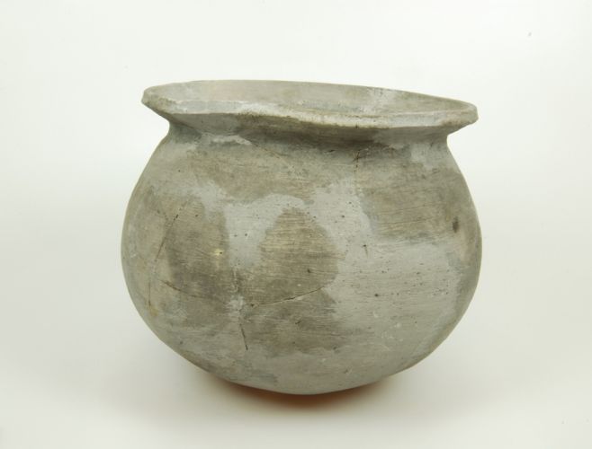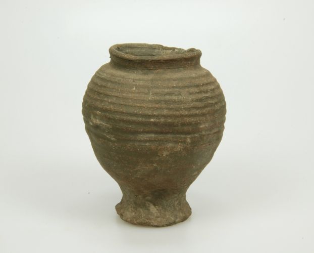 Grijze voorraadpot met afgeplatte bodem