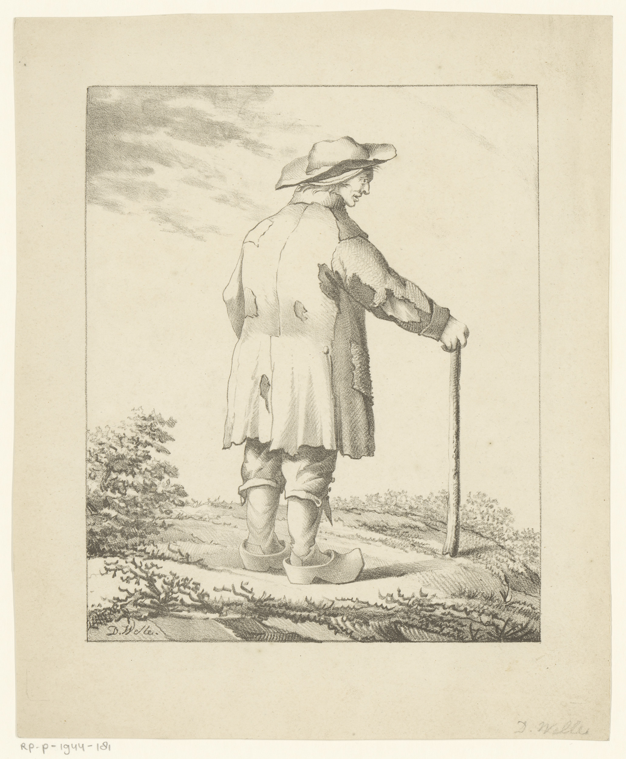 Arme man met wandelstok op de rug gezien