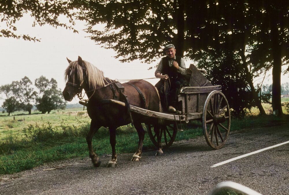 Een Veluwse boer rijdt op boerenkar voortgetrokken d...